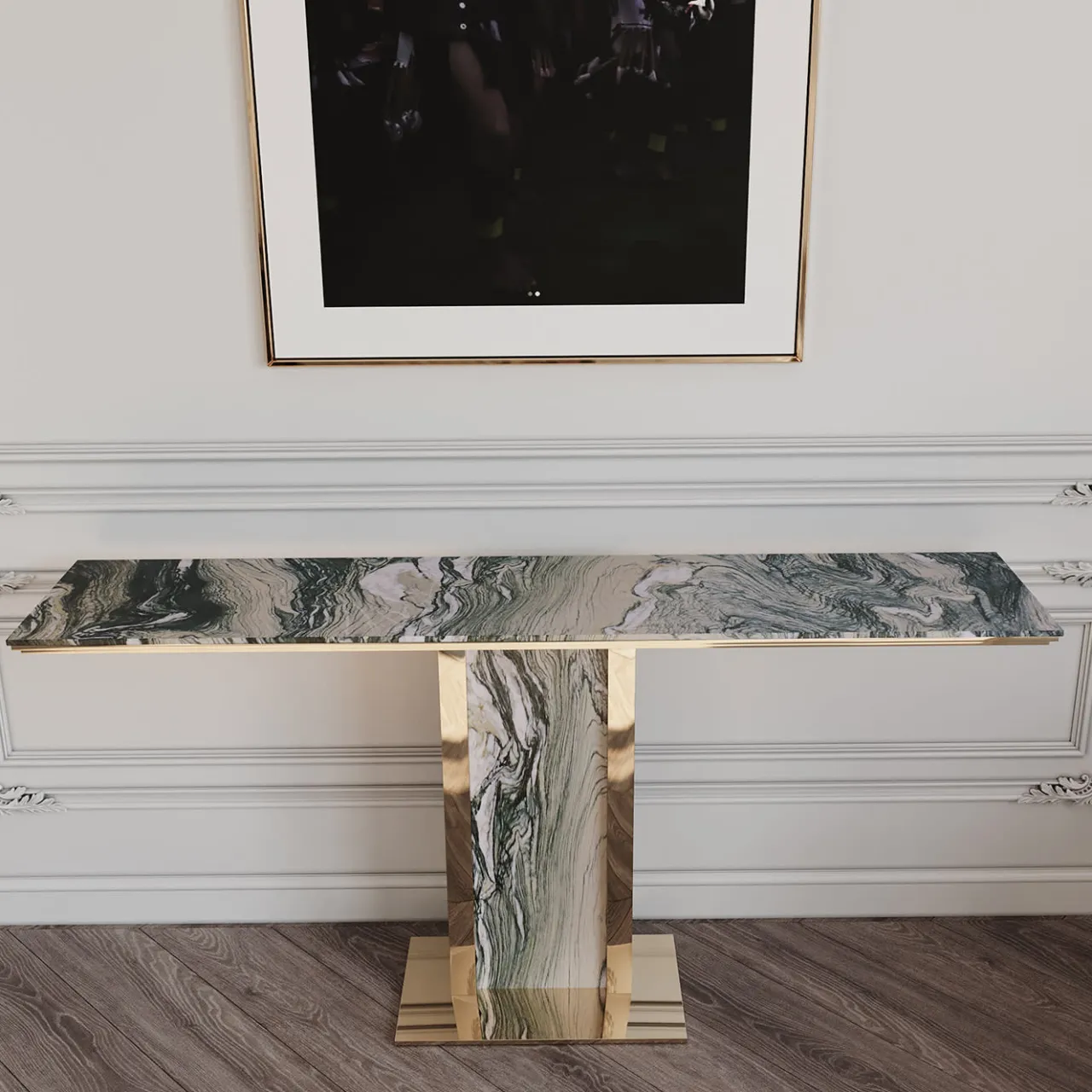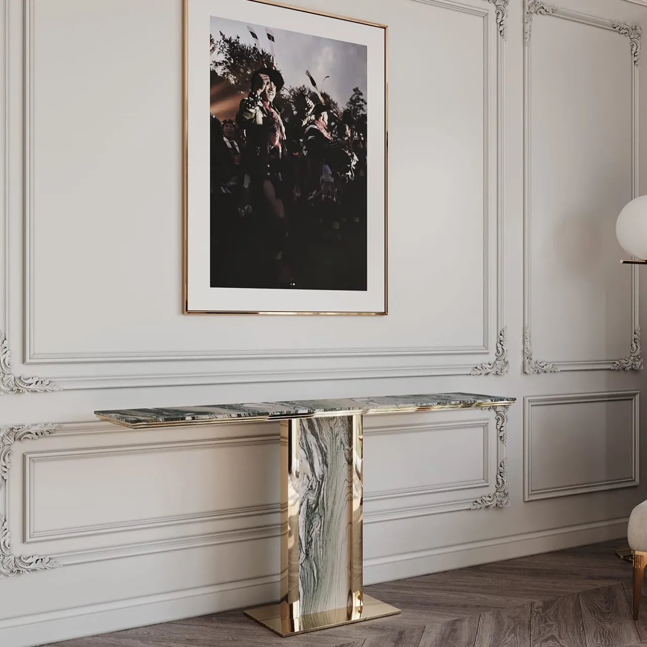 Linee semplici, classiche e geometriche definiscono questa austera consolle rettangolare. Questo pezzo moderno è composto da una struttura centrale in metallo che incornicia una lastra verticale in marmo Cipollino Verde. Il piano rettangolare della consolle, anch’esso in Cipollino Verde, è sostenuto da una struttura metallica nella parte inferiore, realizzata in finitura bronzo lucido. La consolle è disponibile in diverse finiture di marmo e metallo ed è personalizzabile. Per maggiori informazioni, contattare il Concierge. A causa della natura del materiale, il prodotto può variare leggermente.
