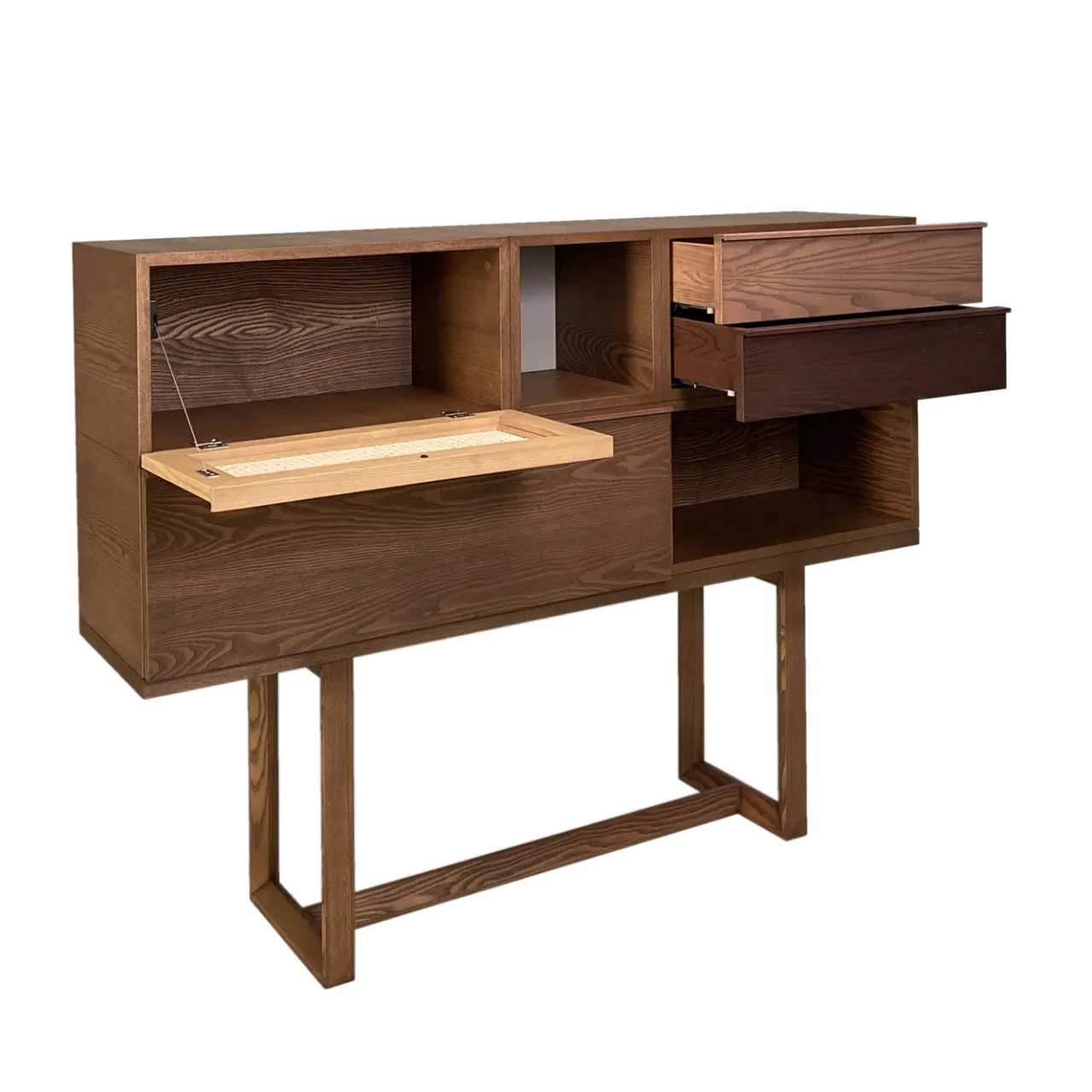 Complemento perfetto della libreria Swing, questa raffinata consolle sarà un accento distintivo e sofisticato per l’arredamento dell’ingresso di una casa contemporanea. Realizzata in legno di frassino, la sua forma di ispirazione architettonica presenta due cassetti, due vani a giorno, un’anta in paglia di Vienna e un’anta a ribalta. Per ulteriori dettagli, consultare il Concierge.