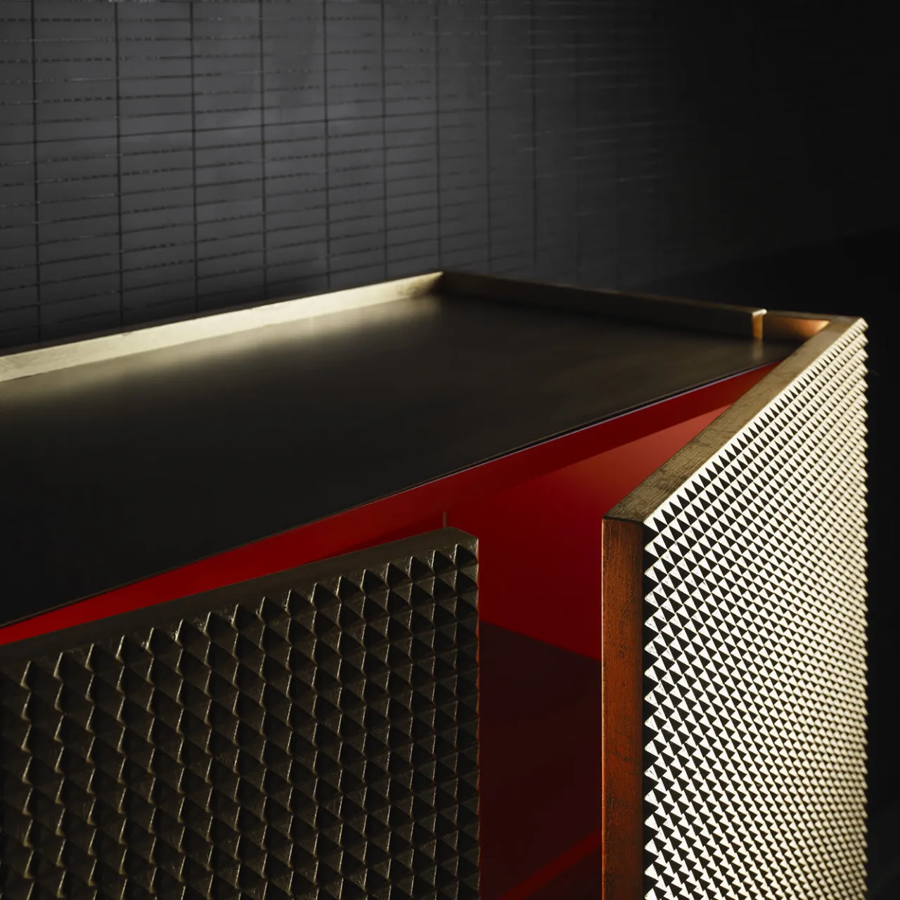 Un design squisito dall’allure senza tempo, questa credenza è superbamente realizzata con materiali di alta qualità. Presenta una struttura in MDF con due ante che vantano una decorazione testurizzata a mano in foglia d’oro, un piano in metallo rifinito in bronzo e un elegante schienale dipinto di rosso. Anche l’interno è caratterizzato da una tonalità rossa, con due cassetti, un ripiano in cristallo e uno specchio luminoso.