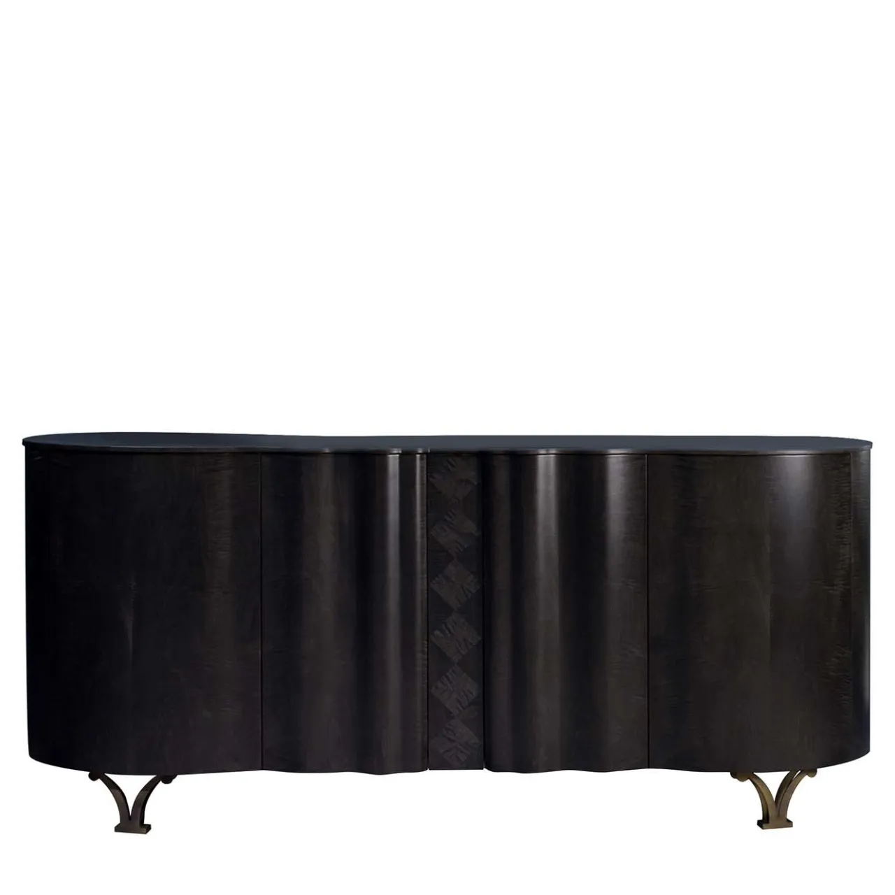 Parte della collezione Mistral, questa elegante credenza vanta l’audace raffinatezza dell’Art Déco e le eleganti tonalità delle frise di platano scuro. Questo imponente pezzo poggia su piedini in metallo con finitura satinata bronzo e combina linee rette con curve sinuose per una silhouette sensuale che evoca i capolavori senza tempo dell’architetto barocco Franscesco Borromini. Un intarsio geometrico centrale aggiunge un tocco prezioso a questo oggetto d’arredo funzionale che arricchirà un salotto, una sala da pranzo o uno studio con un fascino raffinato.
