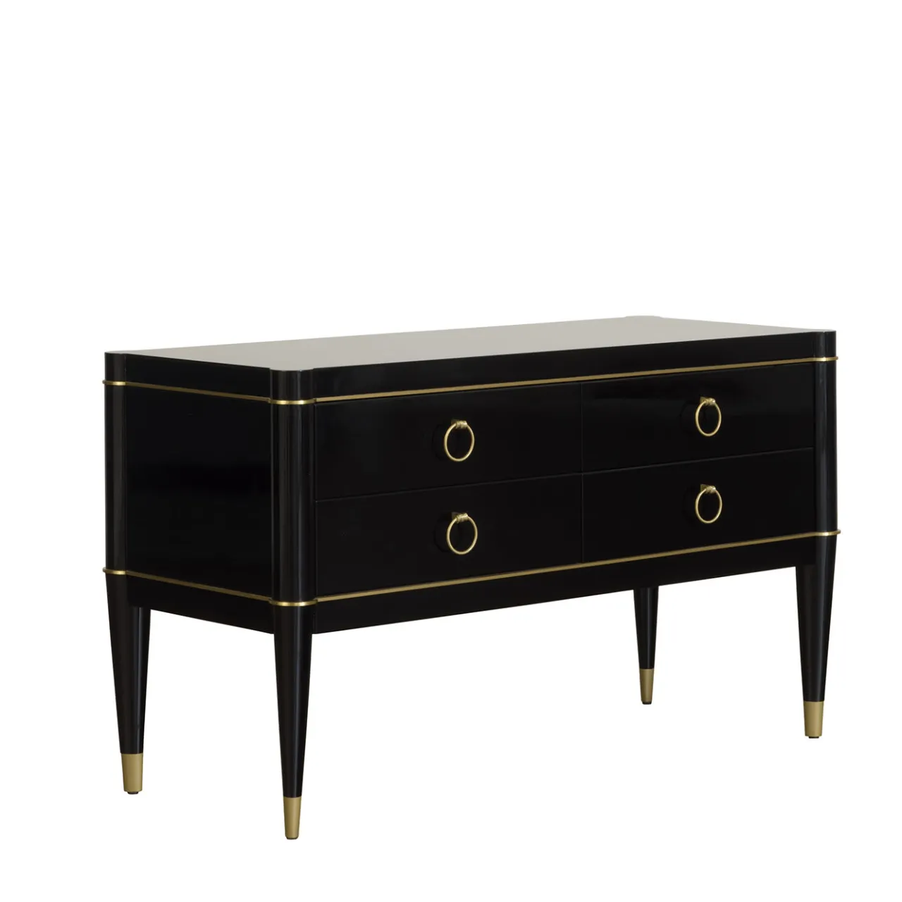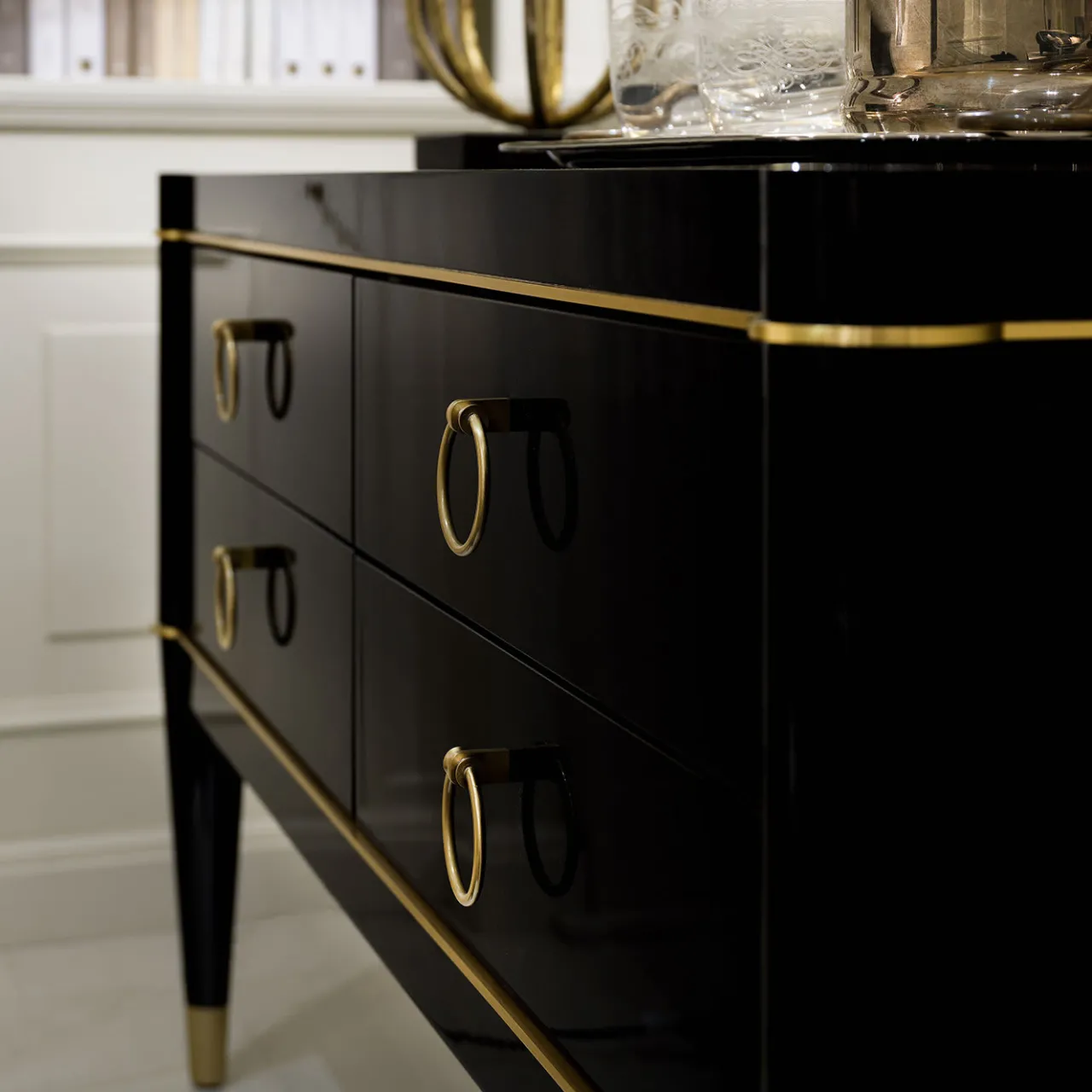 Questa splendida credenza aggiungerà un fascino glamour e retro-chic a un interno classico o moderno, utilizzata come consolle in un ingresso o come spazio espositivo o di stoccaggio in un soggiorno, uno studio privato o una sala da pranzo. La sua forma lineare è realizzata in legno massiccio con inserti in ottone satinato lungo il perimetro, sui piedi e sulle maniglie dei quattro cassetti. Il legno massello si alterna al legno laccato per creare una texture dinamica e distintiva. I cassetti sono dotati di guide Bluemotion e presentano uno schienale in ecopelle. Il metallo può avere una finitura bronzo.