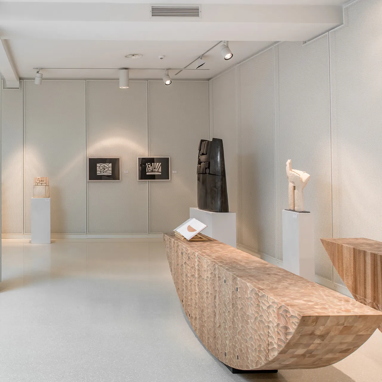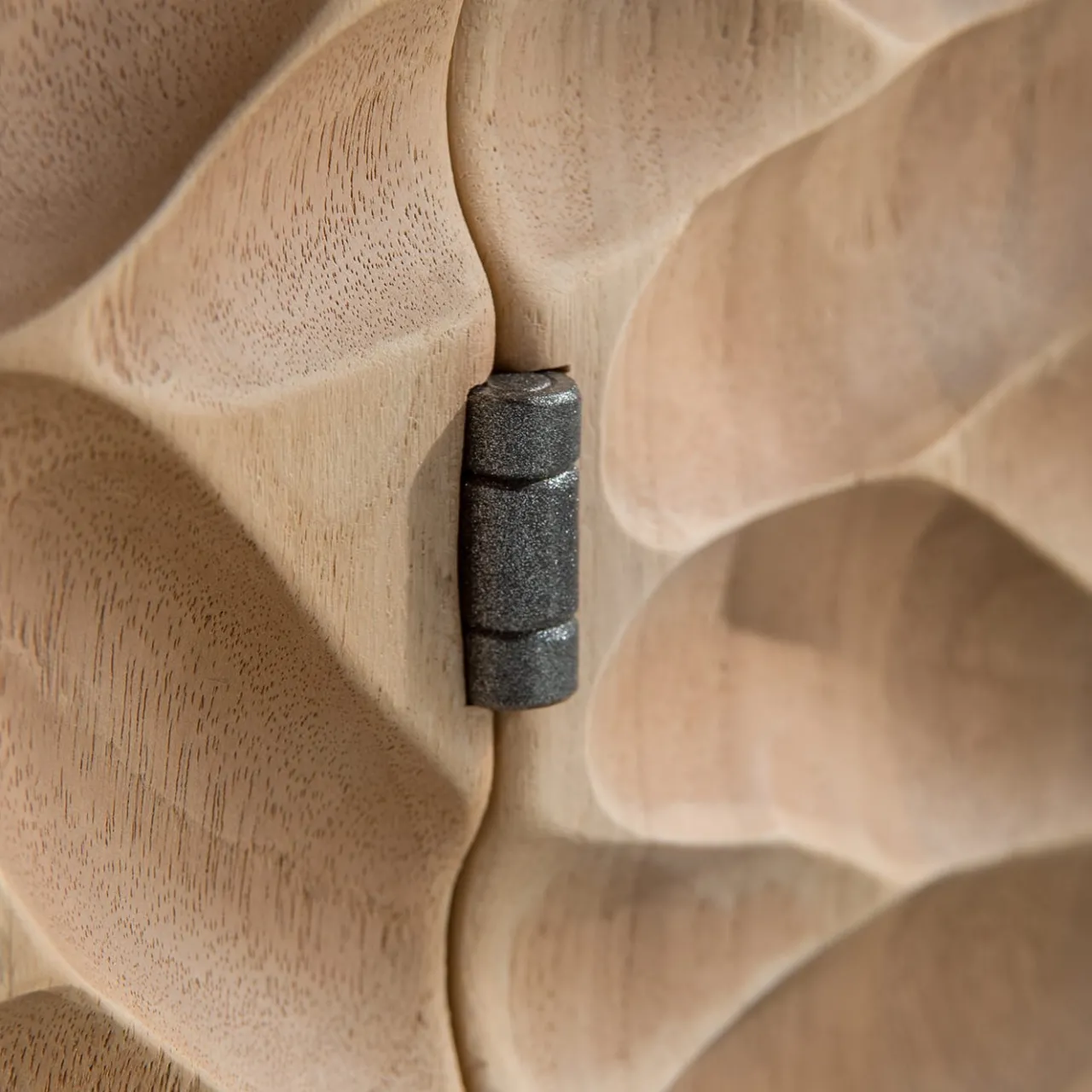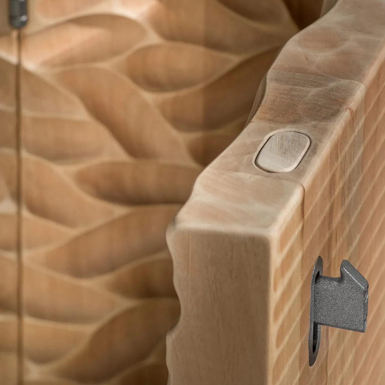Contenitore monolitico a quattro ante, costruito con fibra verticale. Superfici intagliate con una sgorbia (una texture sulla facciata). Bulloni nascosti e cerniere a vista in acciaio brunito.