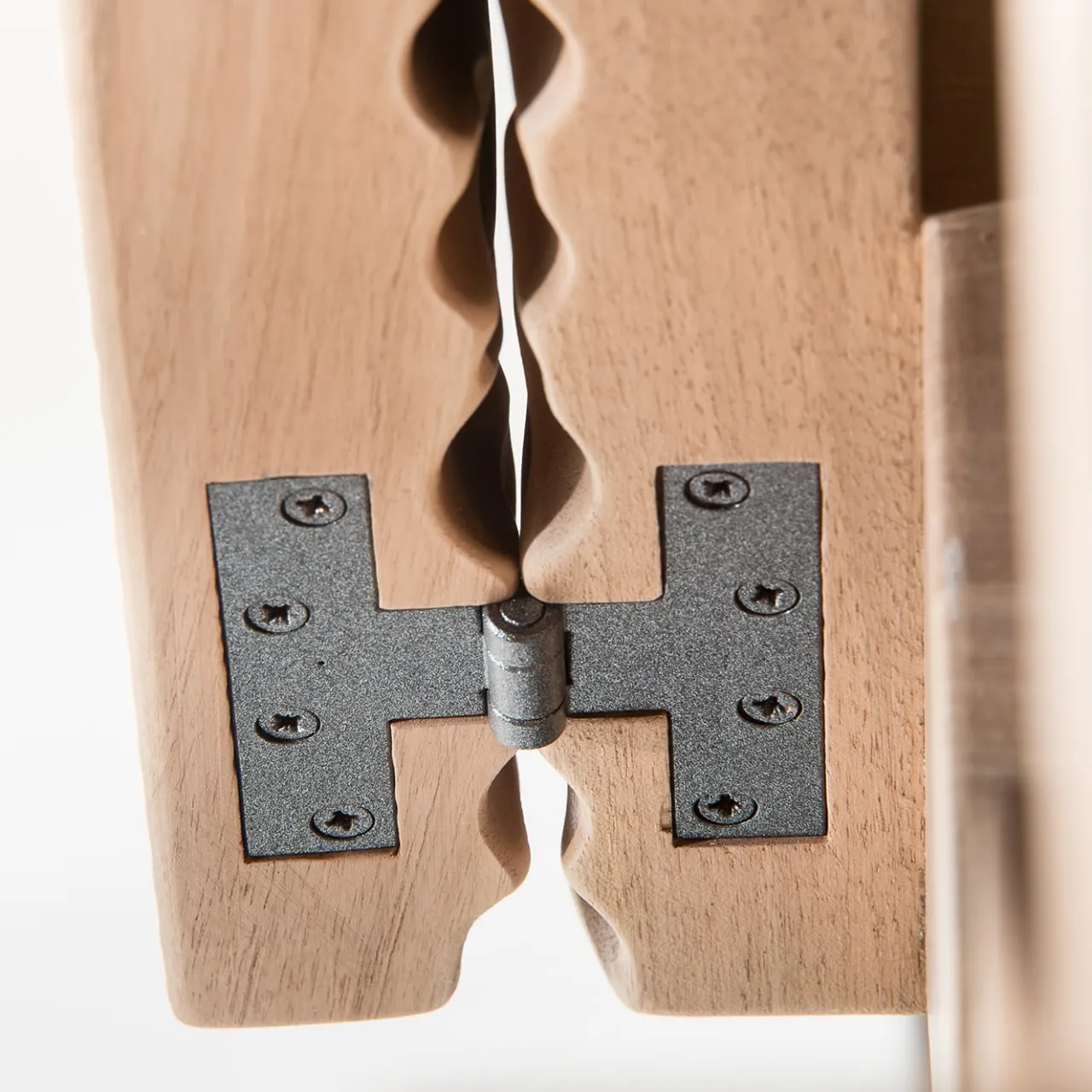 Contenitore monolitico a quattro ante, costruito con fibra verticale. Superfici intagliate con una sgorbia (due diverse texture sulle facciate). Bulloni nascosti e cerniere a vista in acciaio brunito.