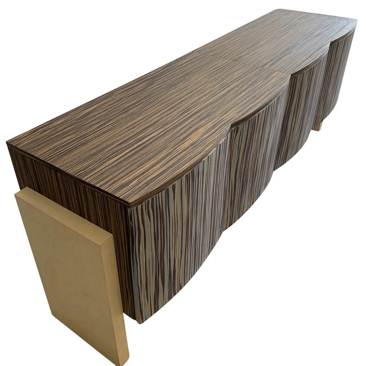 Punto focale originale e accattivante in qualsiasi interno classico o contemporaneo, questa credenza è stata creata singolarmente per un concorso di design italiano. Oggetto d’arte in legno unico nel suo genere, poggia su solide gambe e presenta quattro ante che si staccano dalla struttura principale con un motivo ondulato. Caratterizzata da un’impiallacciatura a fiamma, combina tonalità beige e azzurre che si fondono in un elegante gioco di colori.