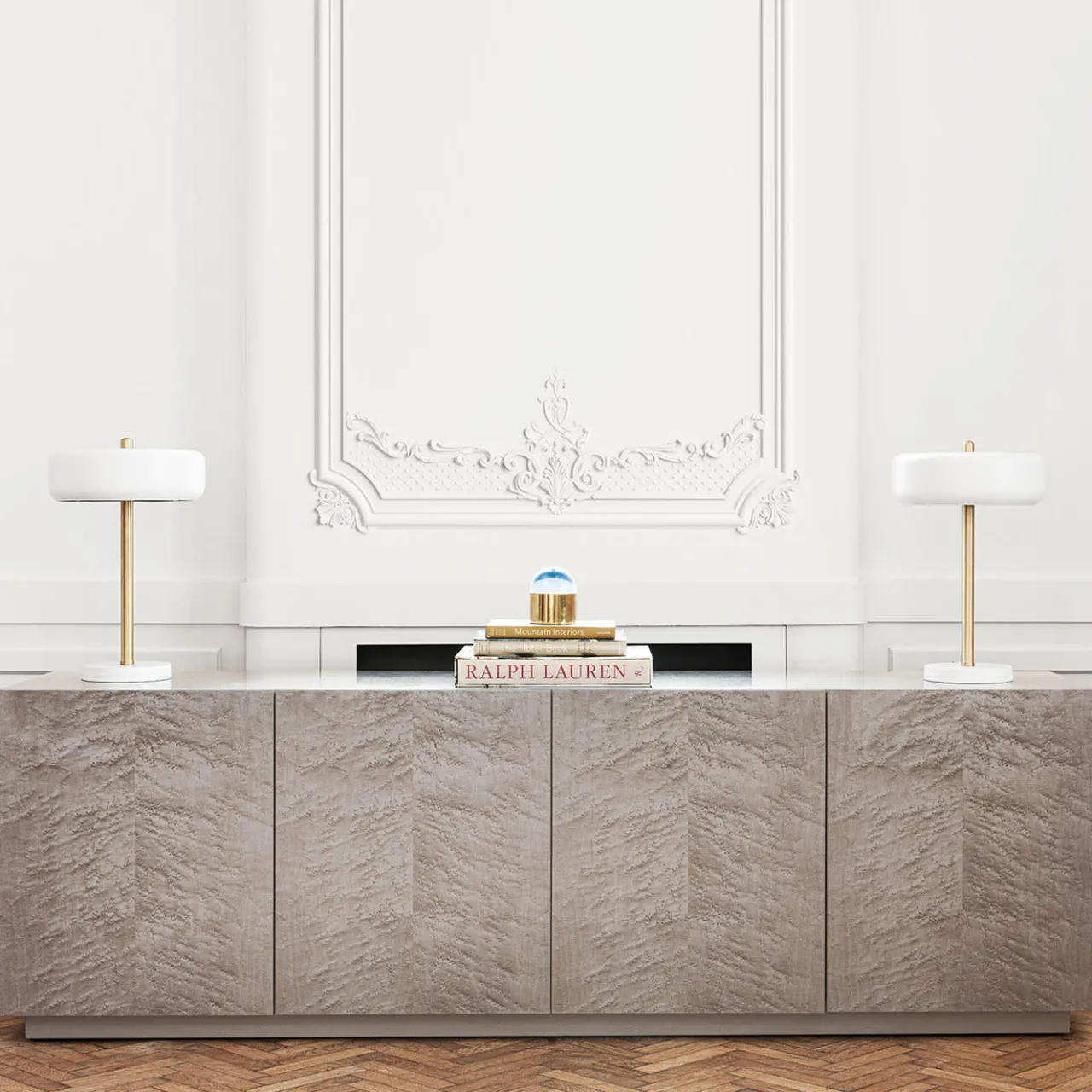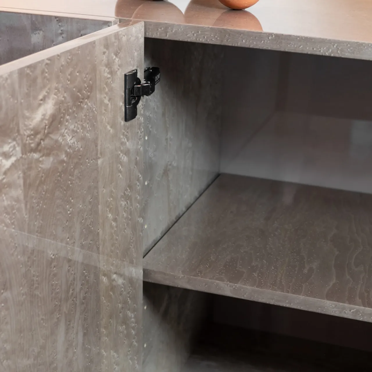 Realizzata con maestria, questa caratteristica credenza offre uno spazio funzionale per riporre le stoviglie o gli oggetti in un soggiorno o in una sala da pranzo moderni. L’imponente silhouette è realizzata in legno d’acero con un’esclusiva finitura grigia lucida a occhio di uccello che crea un motivo distintivo che ricorda piccoli occhi roteanti che emergono dalle linee lisce delle venature. Sollevate su una base a zoccolo minimale, le quattro ante presentano due spazi interni, ciascuno con un ripiano in legno di acero dalla splendida lucentezza a grana profonda, anch’esso in finitura grigio lucido.