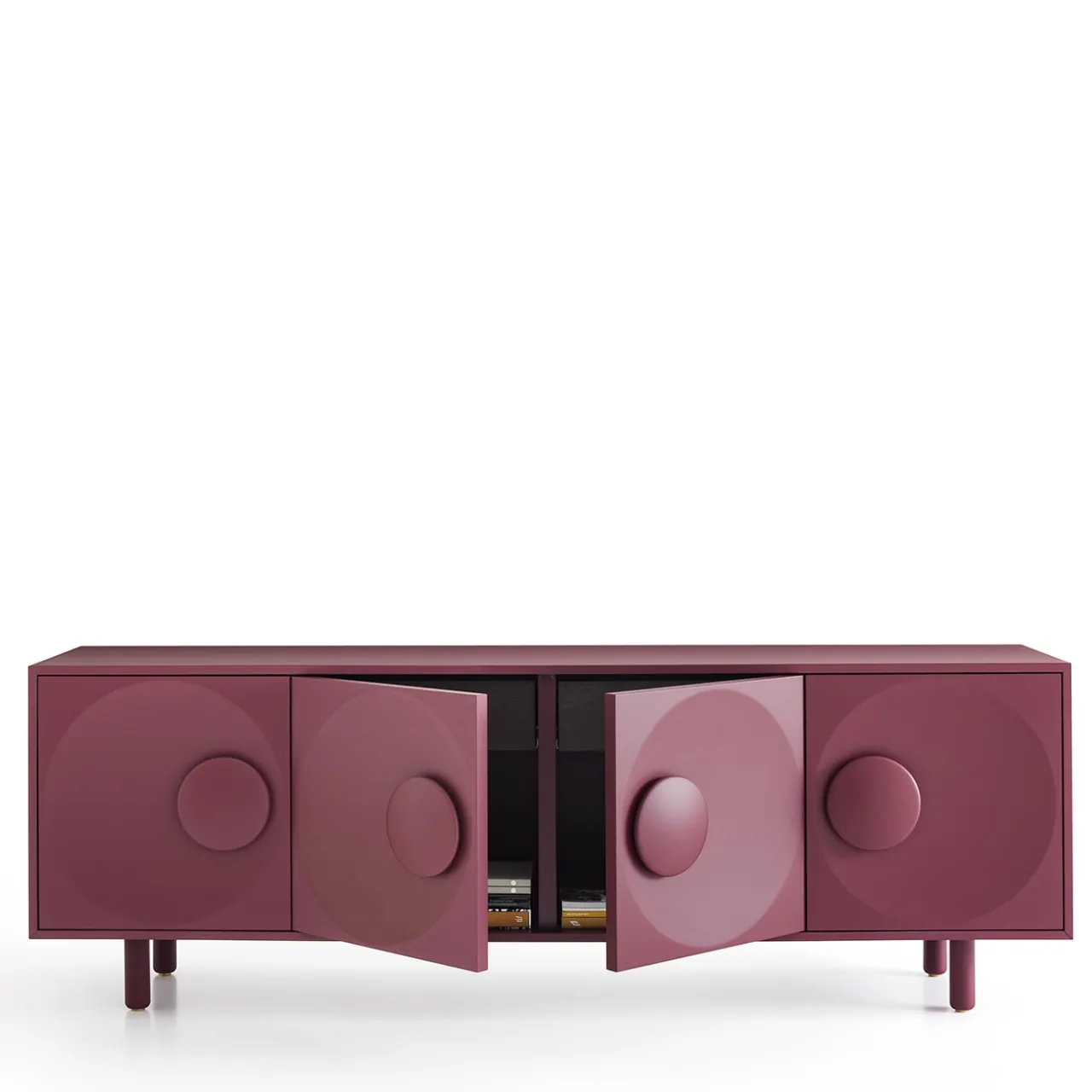Questa elegante credenza deve le sue maniglie a forma di bottone – che emergono da leggere e coerenti depressioni circolari – all’indulgenza nei confronti dei bottoni che andava di moda in Francia durante gli anni ’20. Realizzata in MDF, la struttura rigorosa è laccata in una tonalità rosso vino che si estende ai piedi torniti in legno massiccio, anch’essi arricchiti da punte in ottone. Due ripiani in vetro fumé e due cassetti impiallacciati in rovere scuro completano il design.