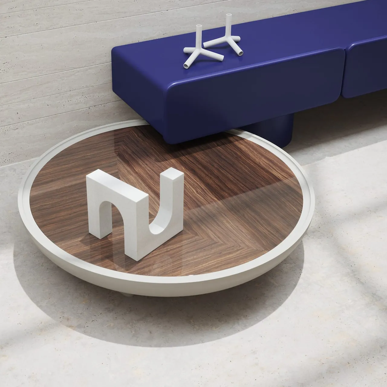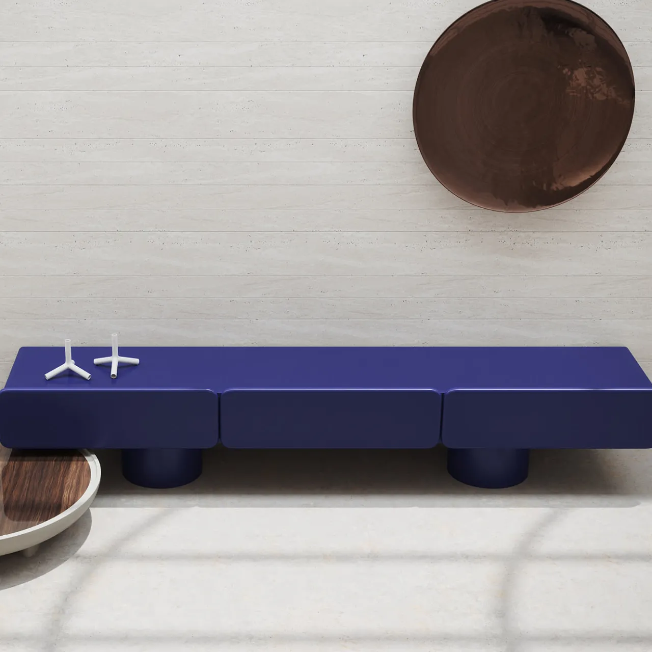 Questa elegante credenza bassa è dotata di tre spaziosi cassetti e di eleganti gambe rotonde. Il suo design comprende frontali e angoli splendidamente arrotondati, che aggiungono un tocco di raffinatezza. La finitura laccata blu notte su MDF conferisce un aspetto liscio e moderno. La credenza poggia su una robusta base a cilindro in metallo, che ne esalta il fascino contemporaneo.