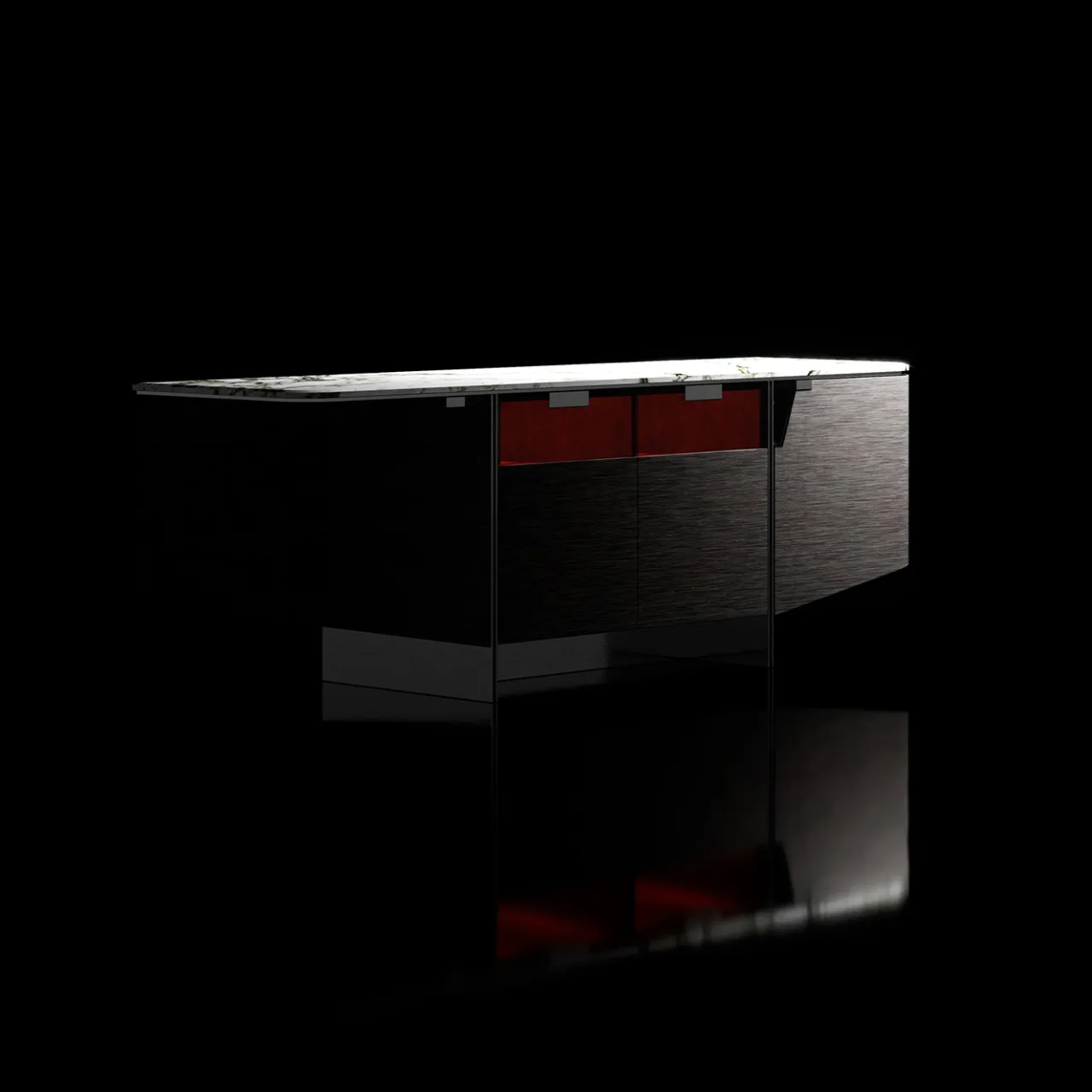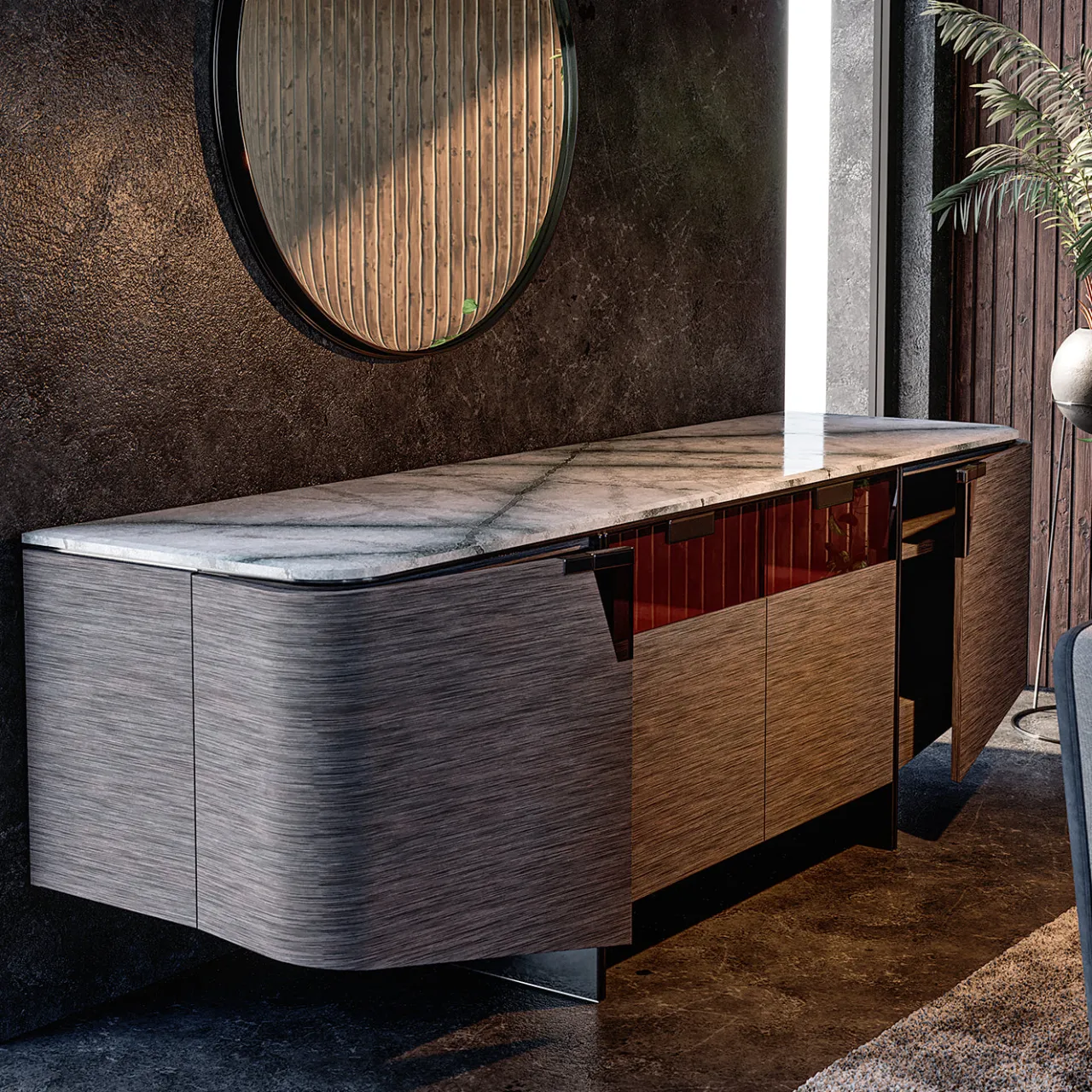 La credenza Bellatrix è caratterizzata da un raffinato piano in marmo e da una finitura effetto legno, con due ante laterali dotate di meccanismi push-pull. La sezione centrale, impreziosita da frontali in vetro, rivela due vani interni rivestiti velluto rosso e illuminati da barre LED integrate. L’intera struttura è sollevata da una base in acciaio e offre ripiani interni per una funzionale capacità di stoccaggio. Completamente personalizzabile, il pezzo è disponibile in una vasta gamma di finiture tra cui pelle, tessuti, legni, metalli, marmi e vetri. Per ulteriori informazioni, si prega di contattare il Concierge.