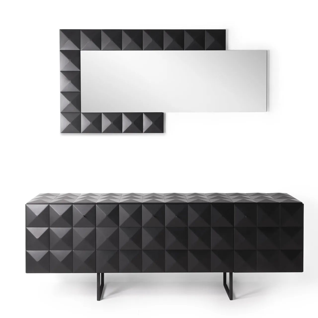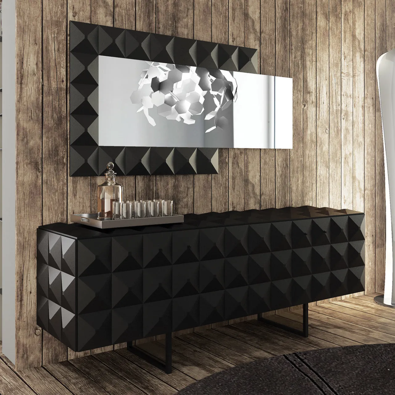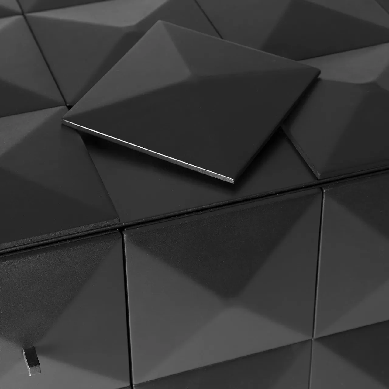 Questa splendida credenza in MDF laccato nero testurizzato sarà un’ottima aggiunta a un ingresso moderno, a un soggiorno contemporaneo o a una sala da pranzo. Piastrelle piramidali 15×15 rivestono interamente questa credenza unica, sostenuta da una base in metallo laccato nero di sezione 25×25 cm. Le due ante a battente e una a ribalta si aprono con un pomello.