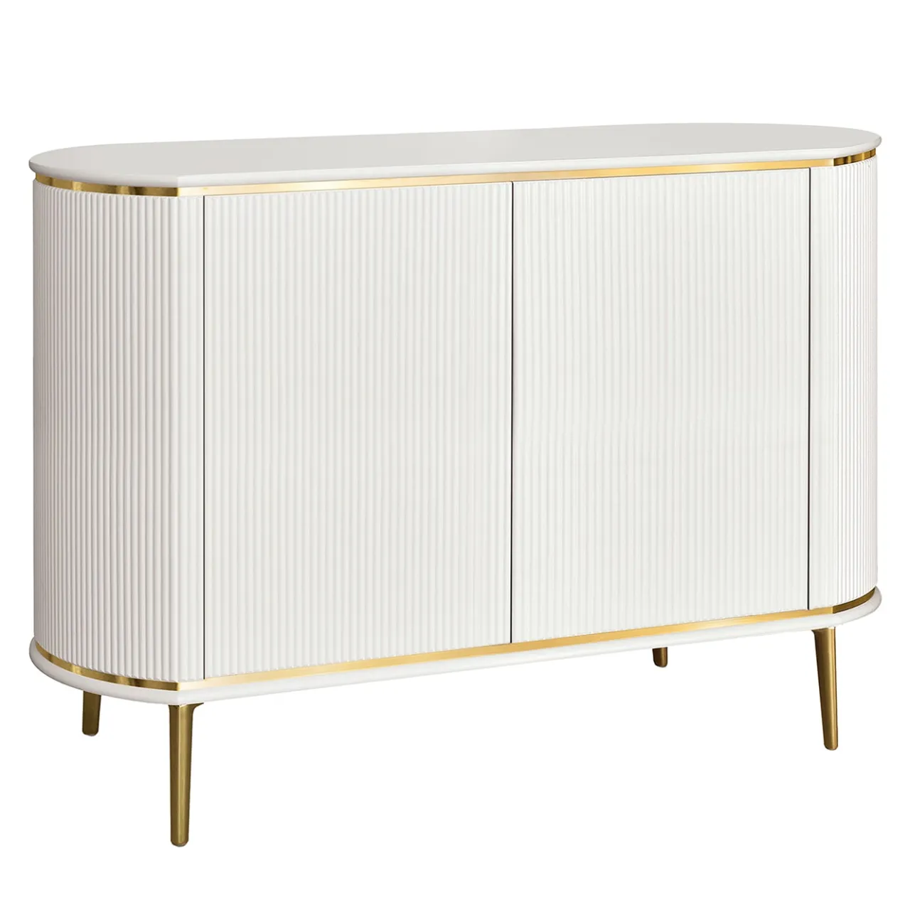 Questo elegante mobile a 2 ante mette in risalto la caratteristica texture canneté, impreziosita da una finitura bianca e da profili e gambe in metallo dorato. Il meccanismo push and pull garantisce un accesso agevole ai suoi spaziosi interni. Combinando design moderno e funzionalità, aggiunge carattere ed eleganza a qualsiasi spazio e rappresenta la scelta ideale per chi cerca un pezzo raffinato ma pratico per la casa o l’ufficio.