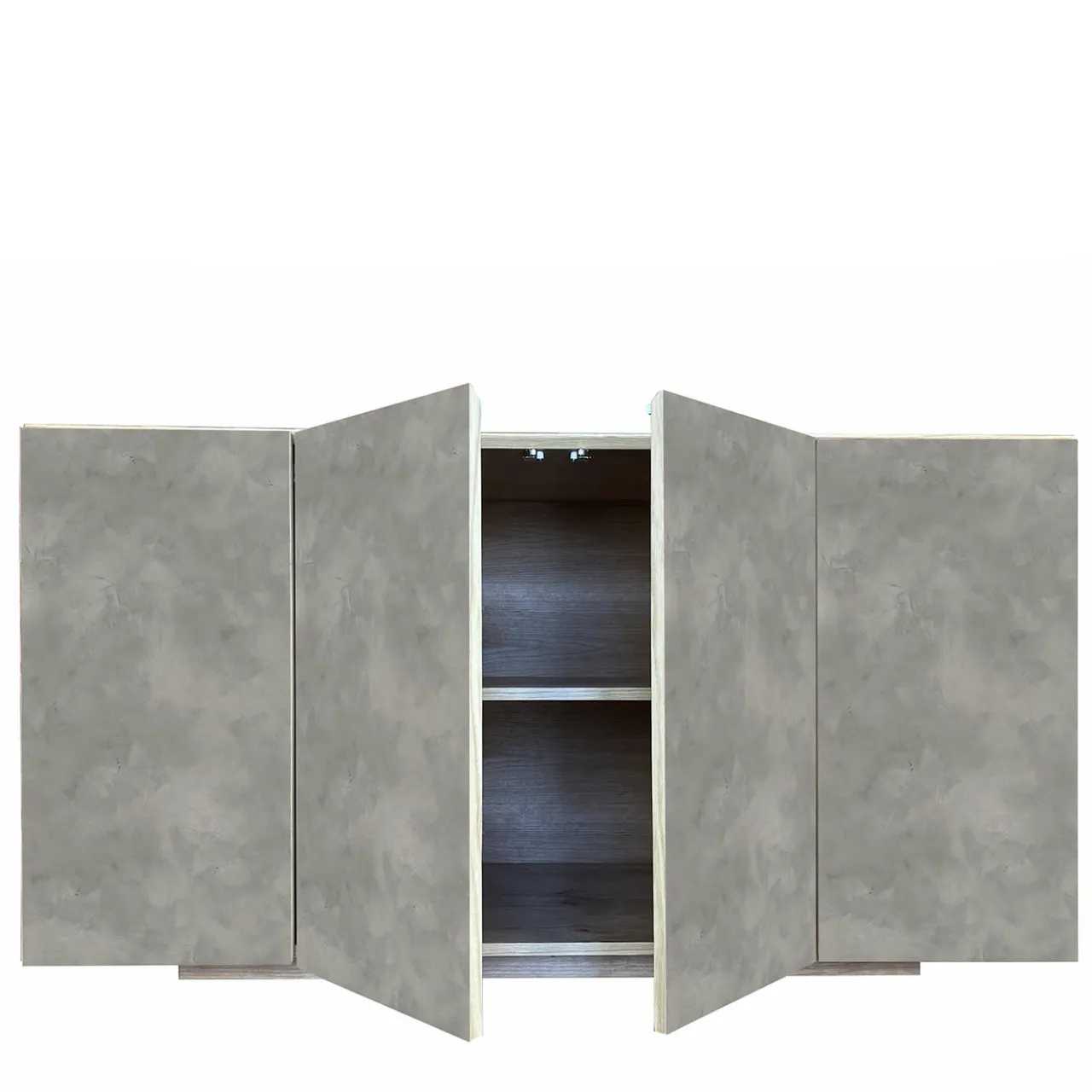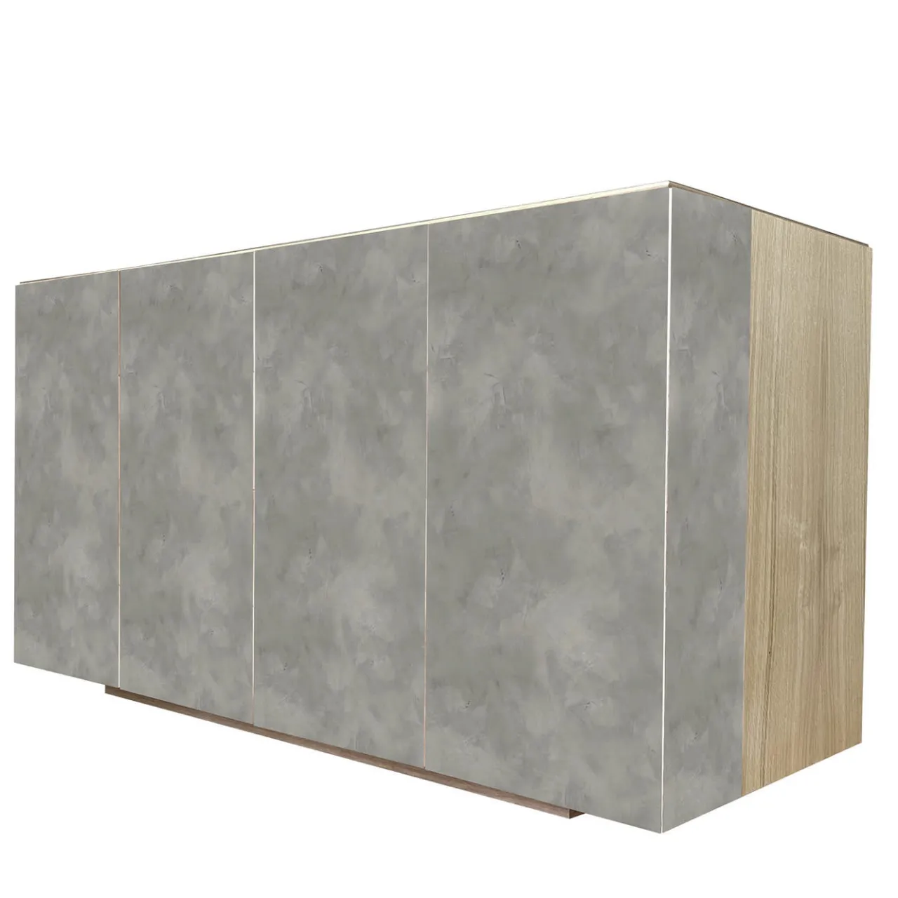 Questa credenza dal design sofisticato fa parte di una collezione di nove pezzi in cui ogni decorazione trae ispirazione dalla tavolozza cromatica della zona costiera di Marina di Pisa, in Toscana. Realizzata in legno di rovere e appoggiata su un’elegante base a plinto, la struttura offre un ampio spazio contenitivo grazie ai tre ripiani interni che si scoprono tirando le quattro ante grigie decorate a mano.