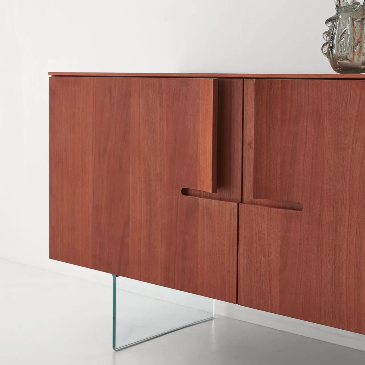 Questa credenza di grande effetto è realizzata in noce canaletto con una vivace finitura rossa a base d’acqua, applicata internamente ed esternamente. È dotata di tre ante e due ripiani in vetro, per offrire soluzioni di contenimento versatili. Le maniglie in legno scolpite si integrano perfettamente nel design, mentre le gambe in vetro creano un effetto fluttuante, aggiungendo leggerezza alla sua audace presenza. Una combinazione armoniosa di funzionalità ed eleganza artistica, ideale per gli spazi abitativi contemporanei.