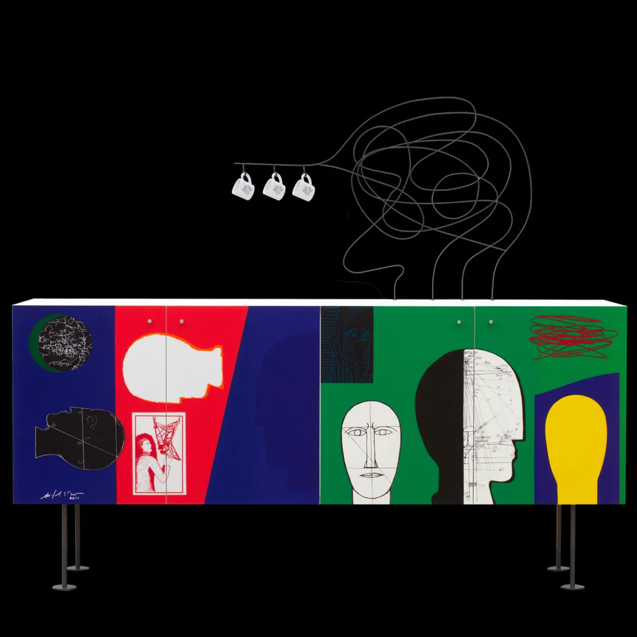 Questa grande credenza rettangolare, realizzata in legno MDF, presenta quattro ante che si aprono per rivelare un interno spazioso. L’esterno delle ante, così come il top ed entrambi i lati, sono stati decorati con disegni di Mimmo Paladino in vari e ricchi colori. Dalla parte superiore dell’opera si estende verso l’alto un elemento scultoreo in metallo a forma di vortice, completo di un piccolo prolungamento che sostiene tre tazze in ceramica con la scritta “Bongiorno” sulla superficie. Questo pezzo è uno dei 49 di questa serie limitata.