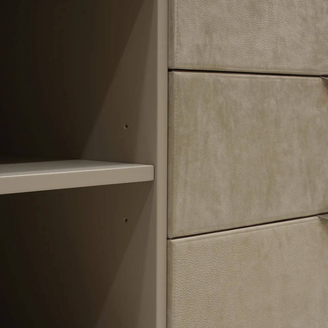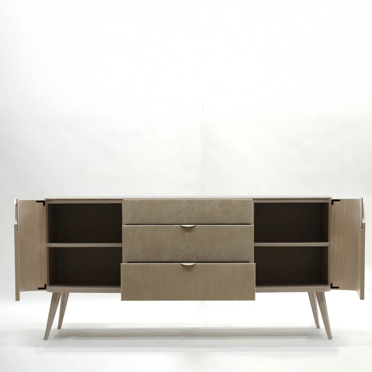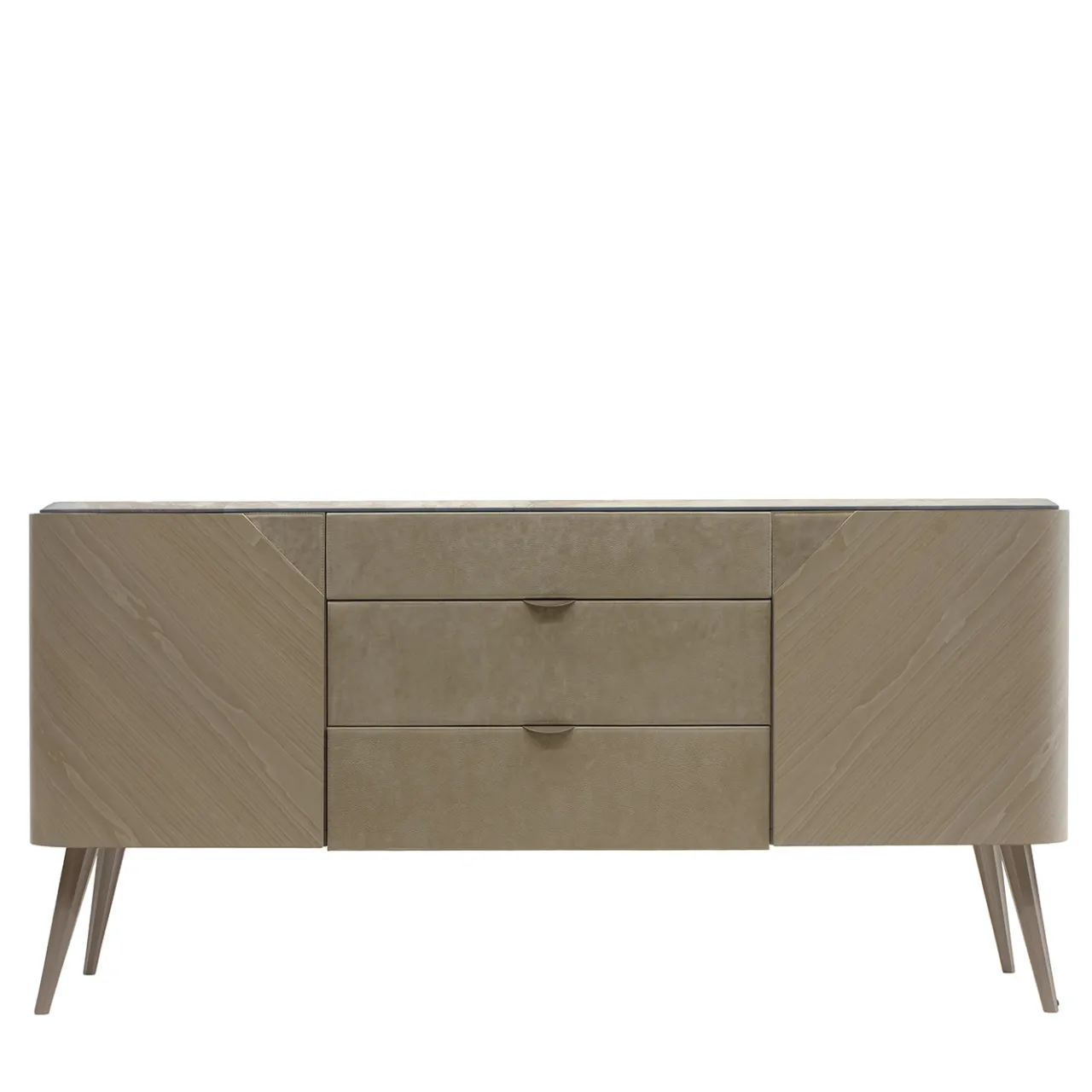 Le linee slanciate rivelano immediatamente il carattere moderno di questa credenza. Dotata di tre cassetti centrali affiancati da una coppia di ante sagomate impiallacciate in noce canaletto e laccate in grigio, permette di ammirare le venature naturali del legno insieme a delicati toni neutri. La pregiata pelle Nubuck riveste il frontale dei cassetti e le maniglie. Per la versione con piano in marmo, contattare il Concierge.