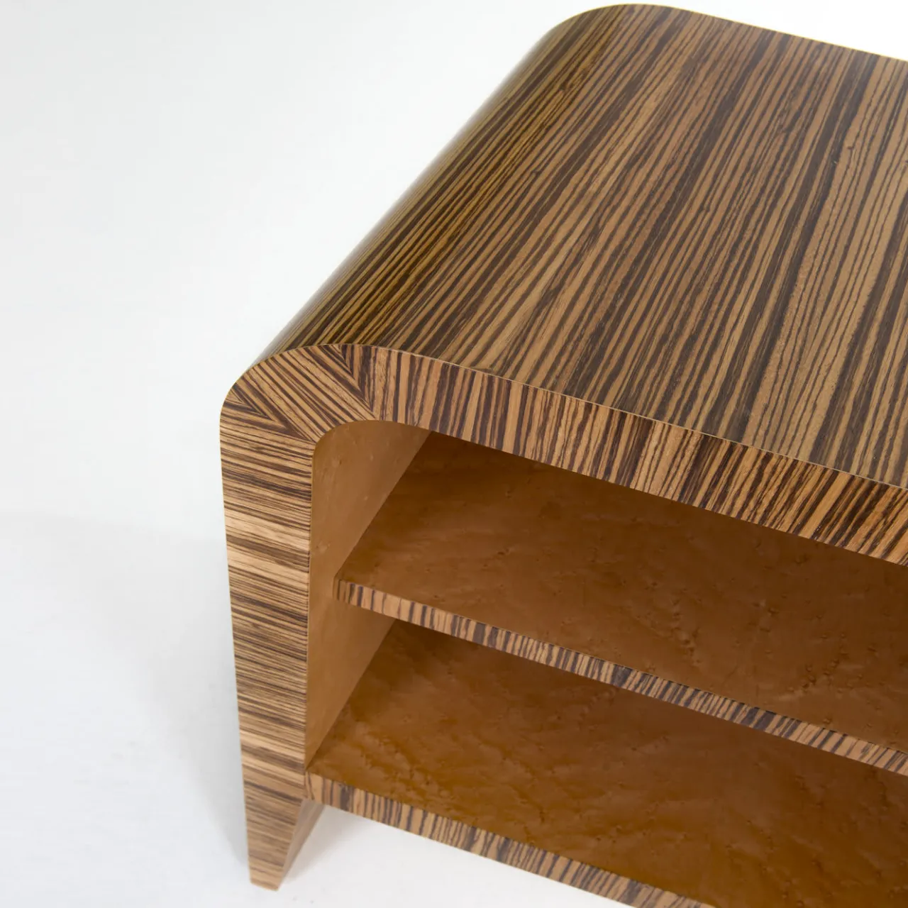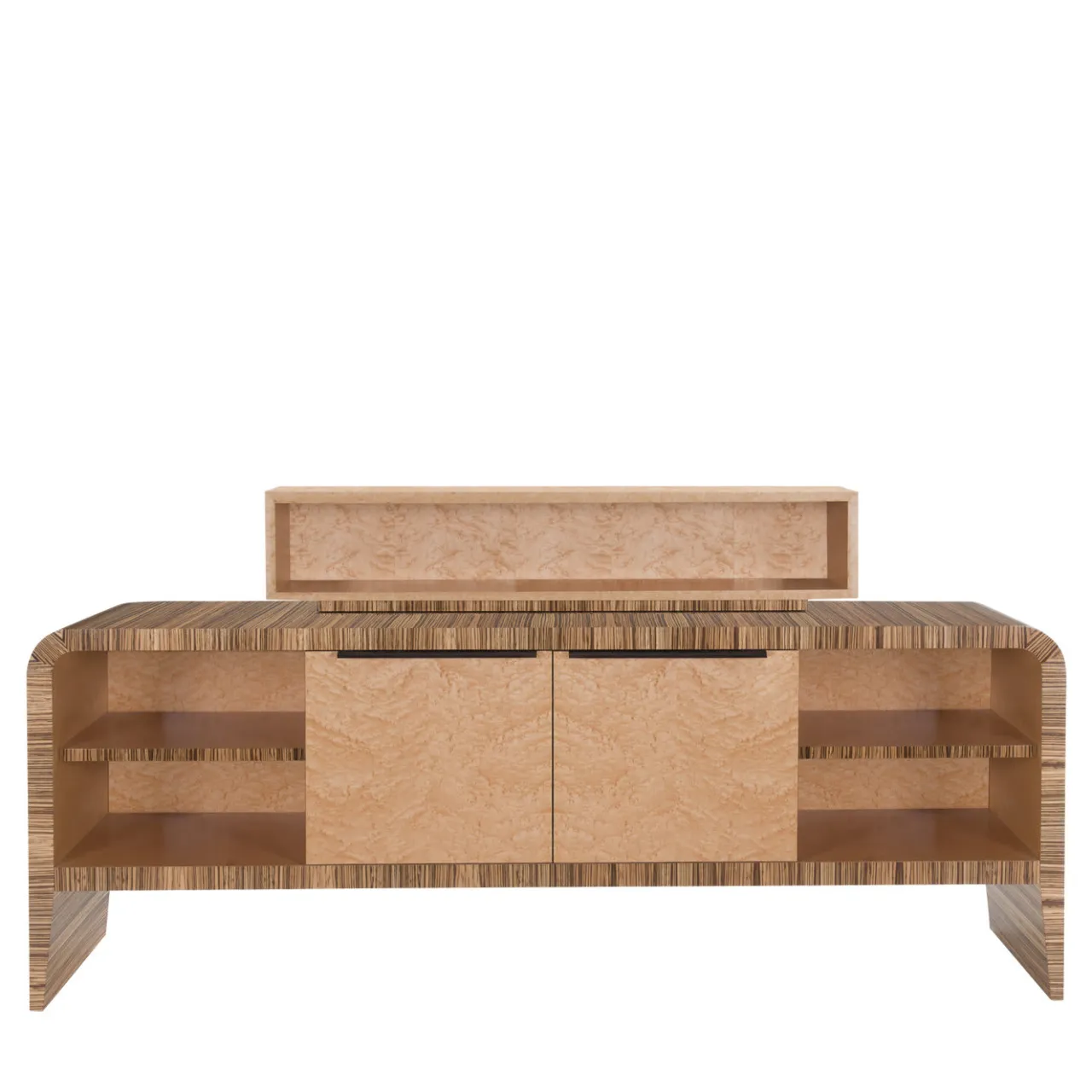 Questo mobile multifunzionale, perfetto per un soggiorno o uno studio, presenta una struttura curva in legno con motivo zebrato e ante in radica d’acero. Le maniglie sono in ebano massiccio. I ripiani interni e l’elemento superiore sono realizzati in radica d’acero. Questa credenza in legno di zebrano può essere utilizzata per riporre diversi oggetti e come funzionale postazione di lavoro. Qualsiasi arredamento sarà immediatamente valorizzato grazie a questo pezzo pregiato. Disegnato da Antonio Berdondini, anno 1944