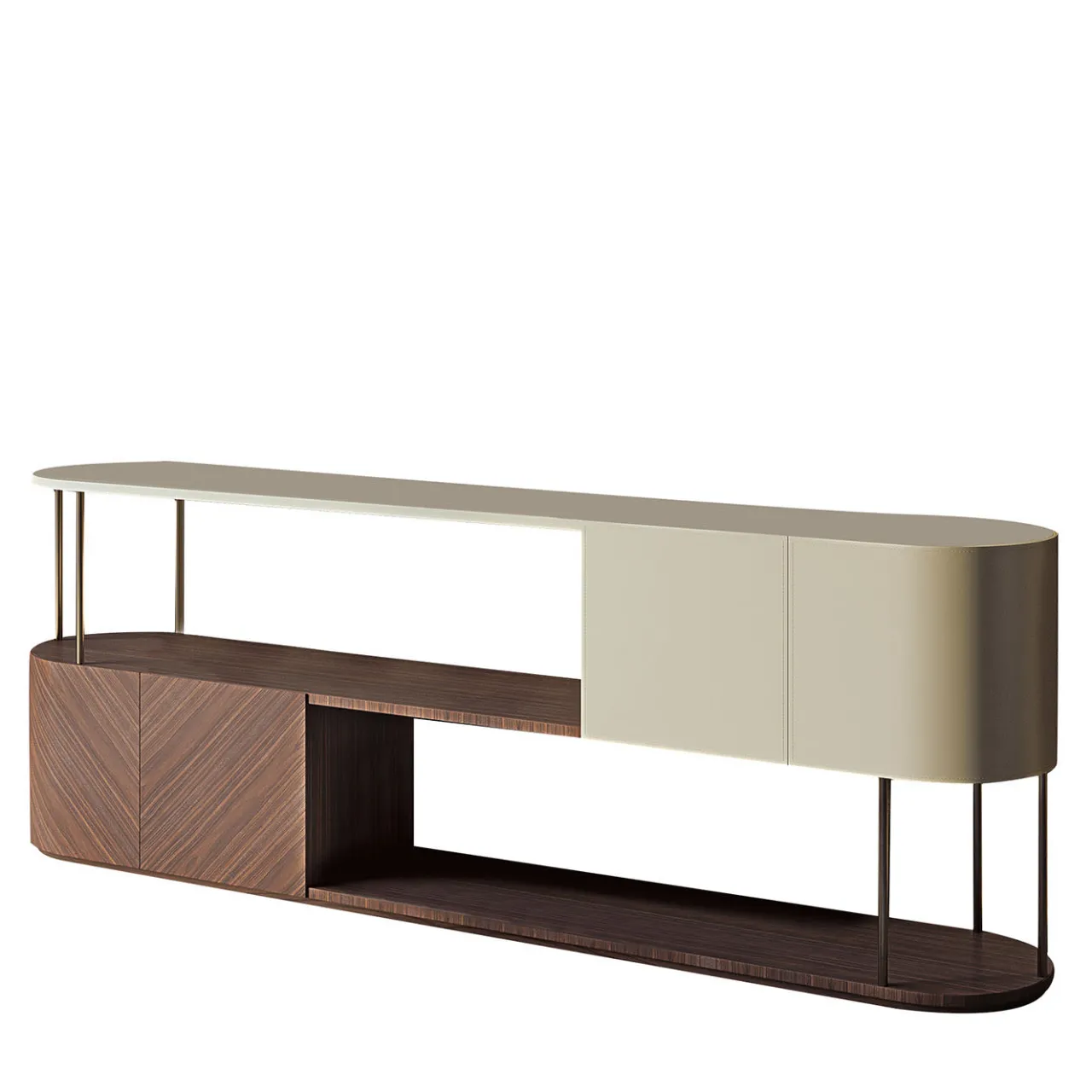 Versione bassa e bifacciale della credenza Gae in noce canaletto e pelle con supporti metallici disponibili nelle finiture bronzo-oro, piombo e brunito. Dotata di scatole apribili. Disponibile anche in legno Tay chiaro e Tay scuro.