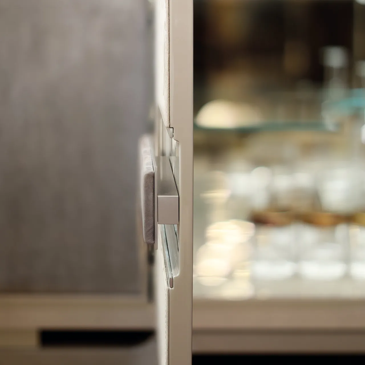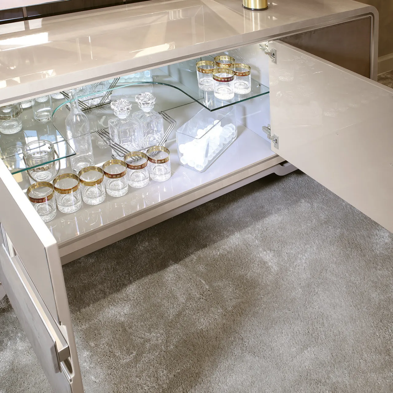 Questa credenza in legno combina un’impiallacciatura in Sicomoro Frisé poliestere con una finitura laccata Visone lucida, sormontata da accenti in metallo palladio satinato. Le quattro ante sono rivestite in nabuk cucito: le due ante esterne sono dotate di un innovativo sistema push-pull, mentre le ante interne sono dotate di meccanismi di chiusura morbida e maniglie in nabuk tonale. Completa di un cassetto interno con chiusura ammortizzata e di uno specchio a scomparsa.