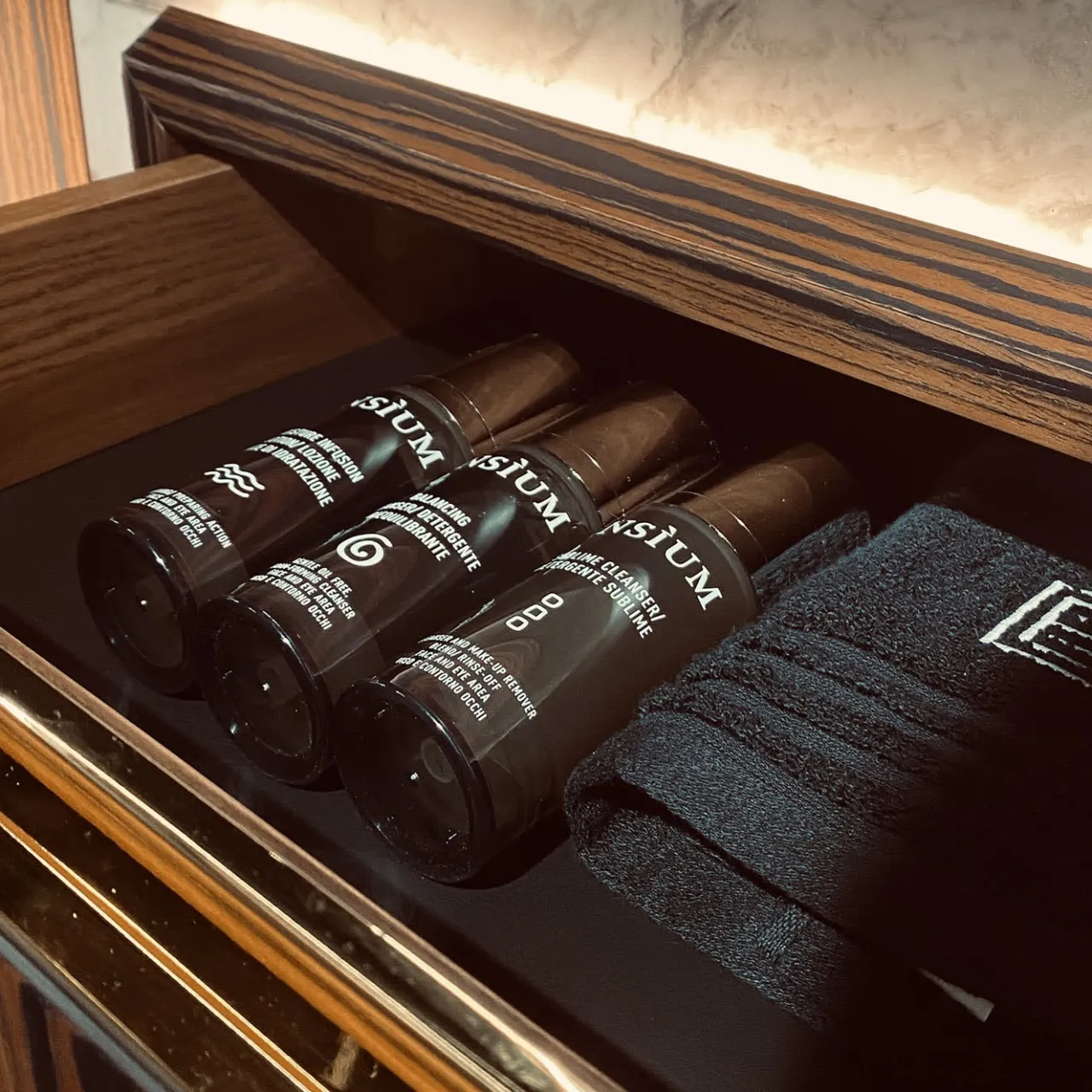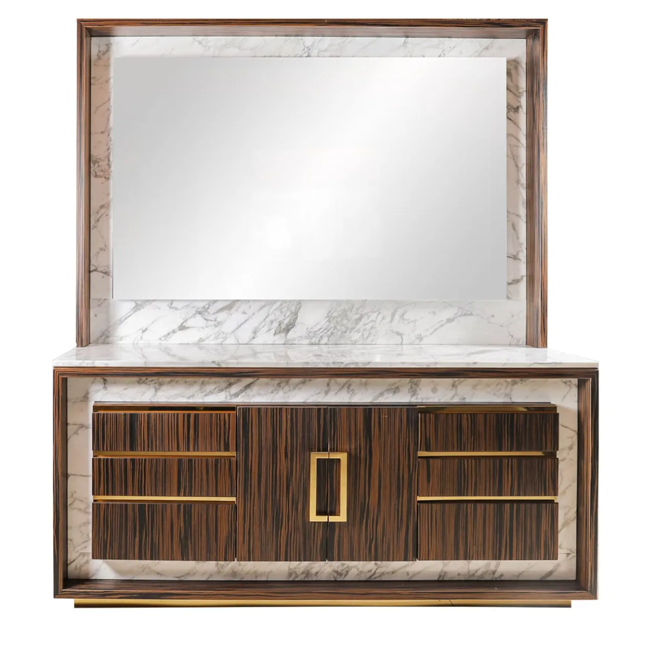 La credenza Frame in noce massello coniuga lo stile contemporaneo con l’artigianato Made in Italy. La cornice racchiude e protegge il marmo Arabescato in una preziosa teca di legno e metallo e lo fa risaltare con un sistema di illuminazione interna dedicato. La credenza è composta da due ante, con ripiani interni regolabili in altezza, e da sei cassetti, tre per lato. Sopra la credenza, uno specchio strutturato in legno con inserti in marmo Arabescato. Chiedere al concierge per le opzioni di personalizzazione.