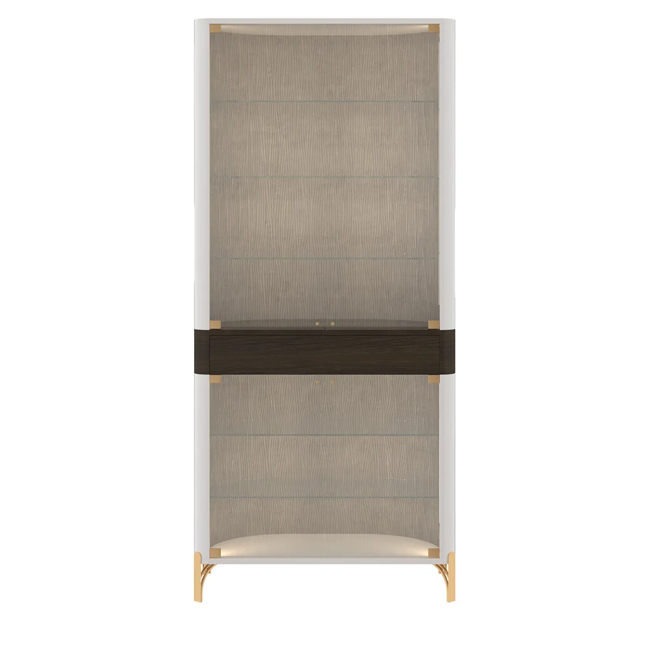 Credenza in vetro a doppia anta, progettato per un utilizzo versatile in cucina, soggiorno o corridoio. Al centro, un cassetto con apertura push-pull offre praticità, mentre i ripiani in vetro trasparente garantiscono un’esposizione ordinata e funzionale. La struttura esterna è rifinita in laccato bianco lucido, con un interno rivestito in tessuto testurizzato color crema che aggiunge un tocco di calore. Sollevato su gambe in metallo con finitura ottone, questo mobile unisce linee pulite e dettagli ricercati, offrendo una combinazione armoniosa di funzionalità ed eleganza.