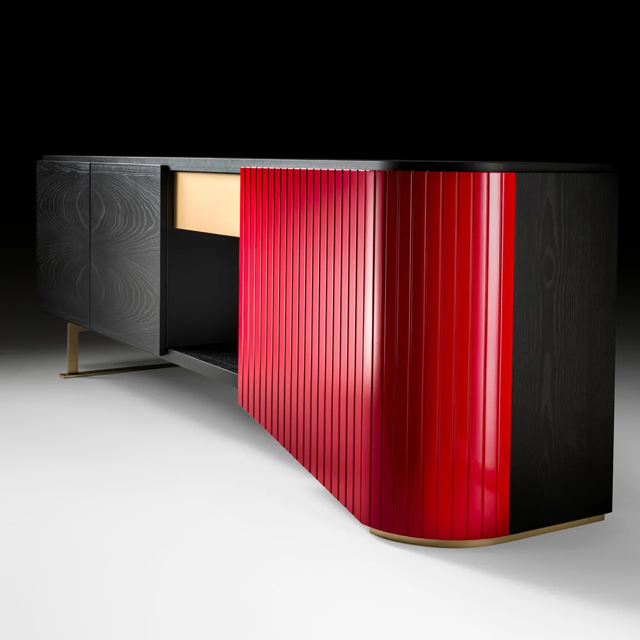 Esempio di squisita artigianalità, questa credenza combina diversi tipi di legno in un design che unisce caratteristiche classiche e moderne. È composta da una struttura in listellare di pioppo con impiallacciatura in frassino, finiture laccate moka. L’anta curva del lato destro ha una finitura poliestere laccata lucida rossa, mentre quella sinistra e i fianchi sono realizzati in legno di noce canaletto. Questo pezzo di grande effetto poggia su piedini in metallo con finitura oro semi-opaco.