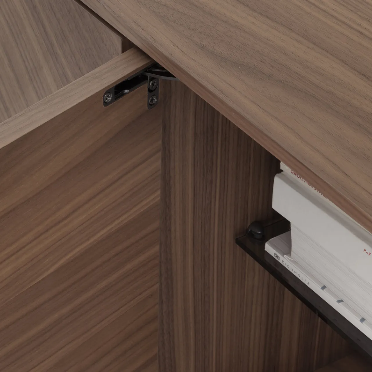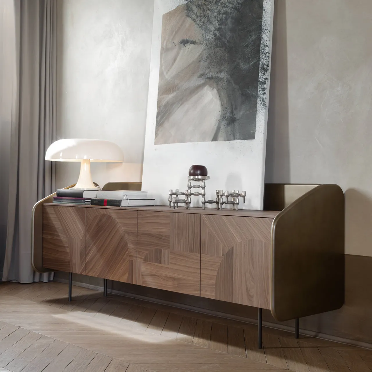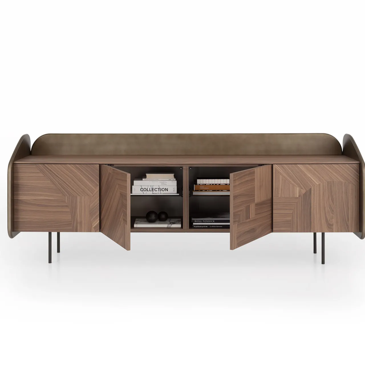 La credenza Intarsio in bronzo presenta una struttura in MDF leggermente arrotondata con una finitura in lacca di bronzo ossidato. Il suo guscio è adornato con intricati intarsi in noce canaletto, che mostrano dettagliati motivi geometrici. L’interno è dotato di ripiani in vetro fumé supportati da un telaio metallico scurito, combinando materiali raffinati per offrire soluzioni eleganti sia per esposizione che per stoccaggio.