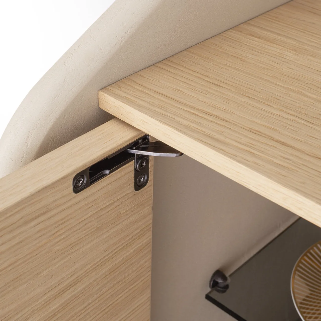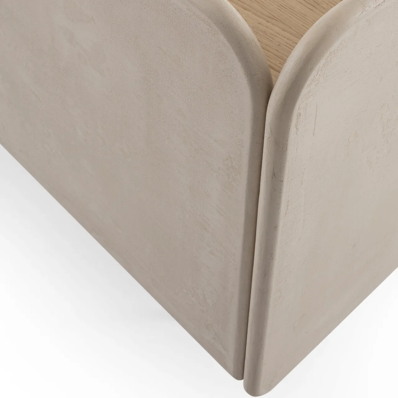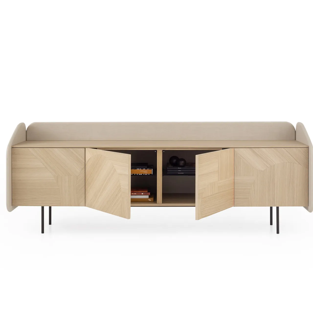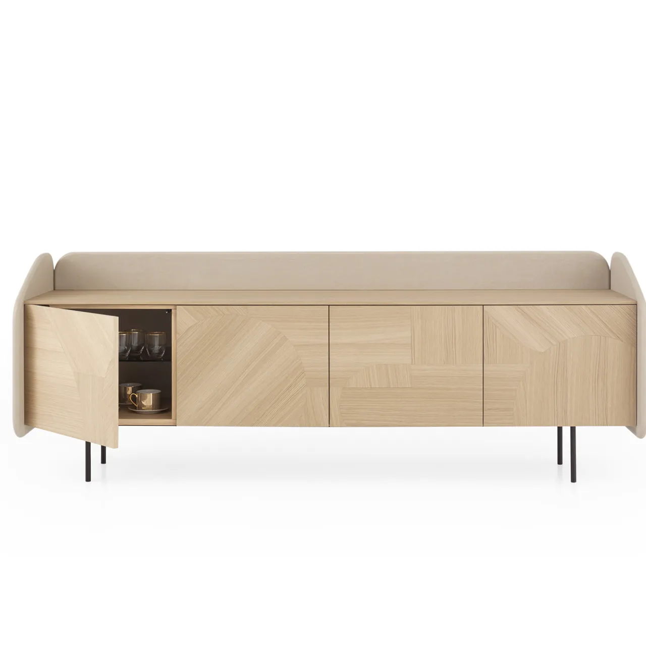 Questa madia presenta una struttura laccata in marmorino di una tonalità malva con bordi dolcemente arrotondati e un guscio in rovere naturale decorato con motivi geometrici in legno intarsiato a mano. Offre quattro ante con ripiani interni in vetro fumé supportati da una struttura in metallo scurito, combinando materiali raffinati e una lavorazione meticolosa per una soluzione di stoccaggio sofisticata.
