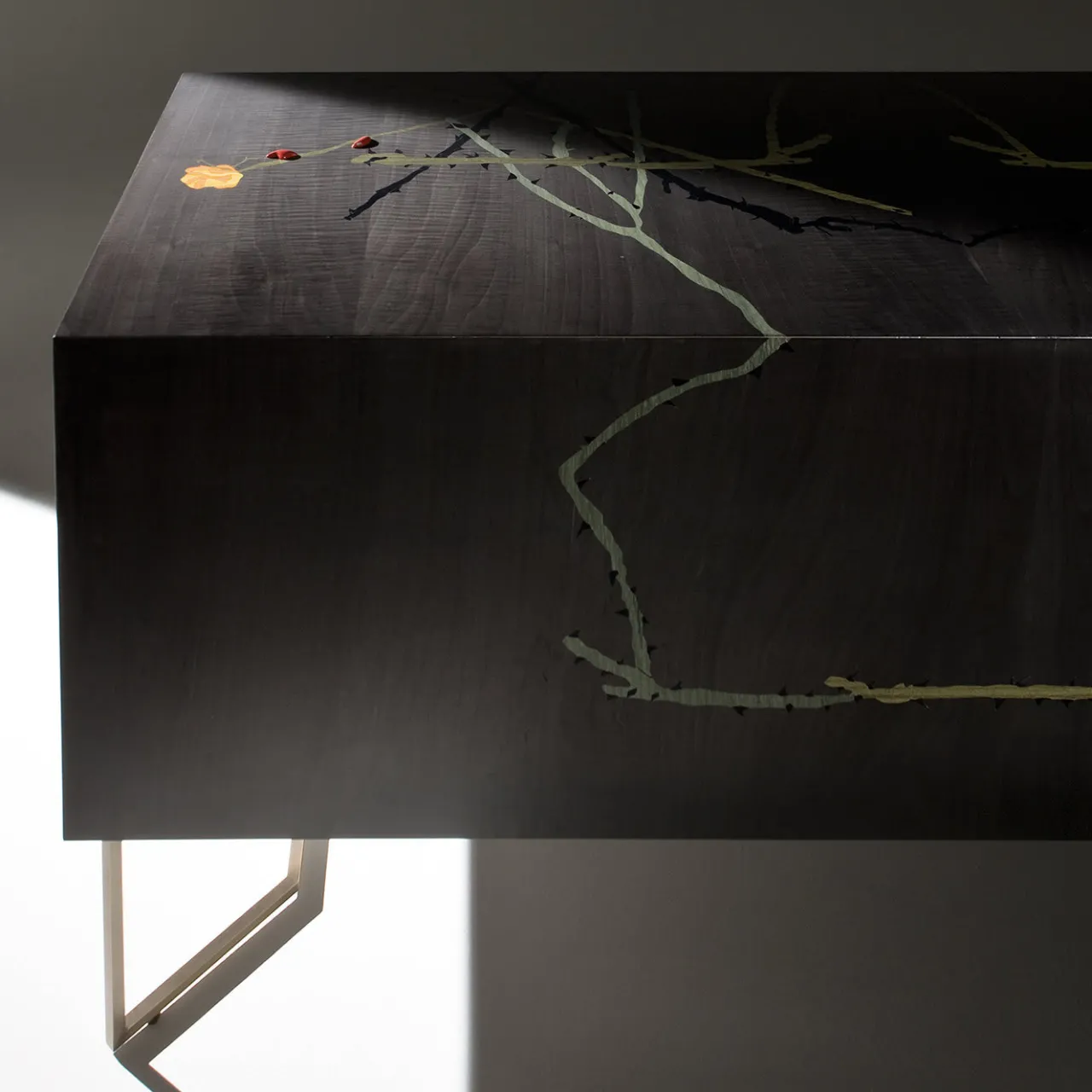Due lineari gambe geometriche in ottone sostengono questa lunga credenza rettangolare in legno. Quest’opera d’arte funzionale è uno dei soli 21 esemplari di questa serie limitata. Un motivo astratto e multicolore adorna questo pezzo su tutti i lati, compreso il piano, esaltando l’aspetto della credenza e arricchendo allo stesso tempo l’arredamento circostante. Le caratteristiche aggiuntive includono due ante push-pull, due cassetti interni e ripiani.