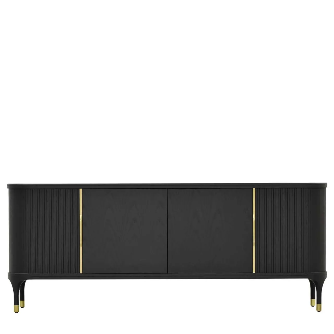 Poggiata su quattro piedi affusolati impreziositi da dettagli in ottone, questa credenza è un pezzo sofisticato adatto a un’ampia varietà di decori. La struttura in frassino massiccio presenta un’elegante finitura nera, che si sposa con la texture scanalata delle due ante scorrevoli laterali. Le ante centrali a battente mostrano le caratteristiche venature del frassino e presentano due sottili maniglie in ottone sui lati. Un ampio tavolo in legno, disponibile su richiesta con piano in vetro, completa questo pezzo esclusivo. Progettato da Libero Rutilo.