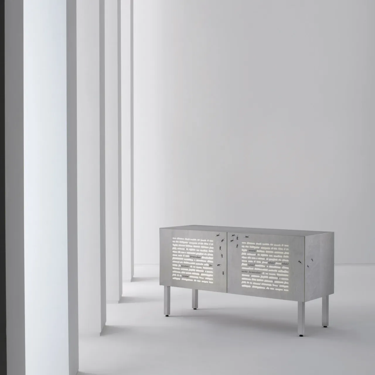 Uno sciame di formiche nere su un legno bianco è la singolare composizione di questa credenza disegnata da Emilio Isgrò e realizzata a mano dagli abili artigiani di Laura Meroni. Il mobile è stato realizzato artigianalmente utilizzando legno di pioppo multistrato per la struttura, che è stata poi rivestita con impiallacciatura di acero naturale. Quando è aperto, le ante rivelano ripiani regolabili e una base regolabile in acciaio inox spazzolato. Edizione limitata.