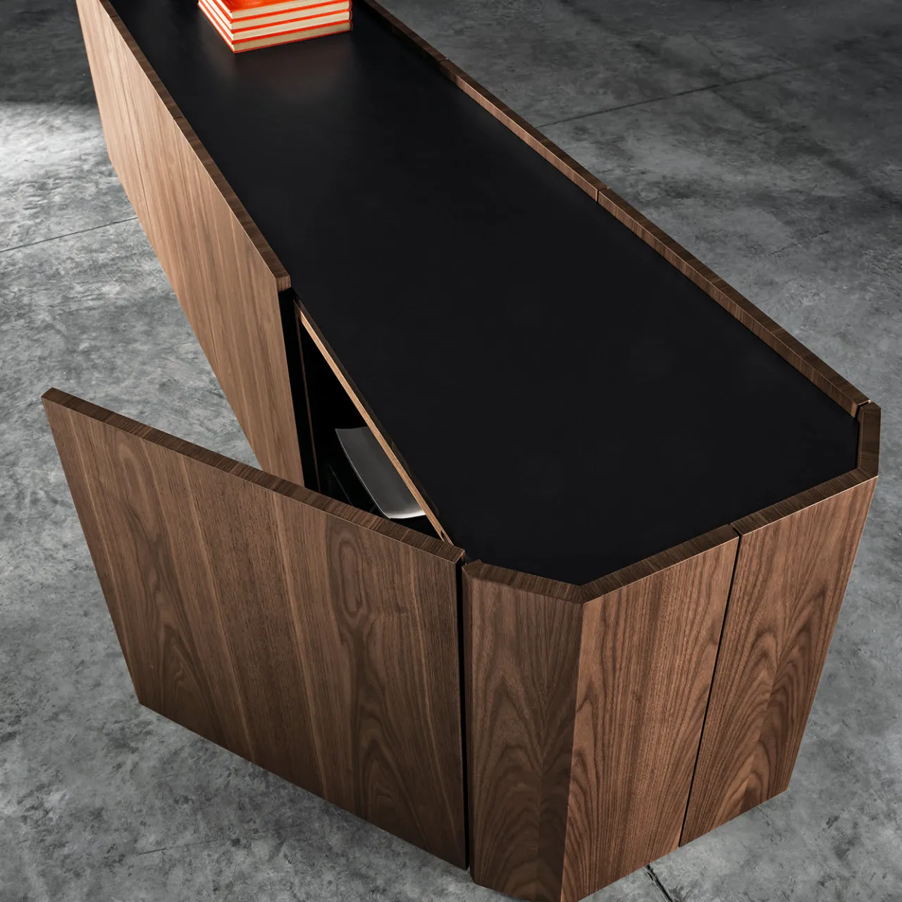 Questa splendida credenza è molto più di un semplice contenitore. Il suo fascino elegante combina linee geometriche e materiali pregiati che vantano un fascino naturale. Gli angoli tagliati della silhouette creano una forma ottagonale gioiello in noce canaletto con piano nero opaco e base a zoccolo in ottone chiaro satinato. Questo pezzo è disponibile anche a due o tre ante e in diversi materiali e finiture; per maggiori dettagli, rivolgersi al Concierge.