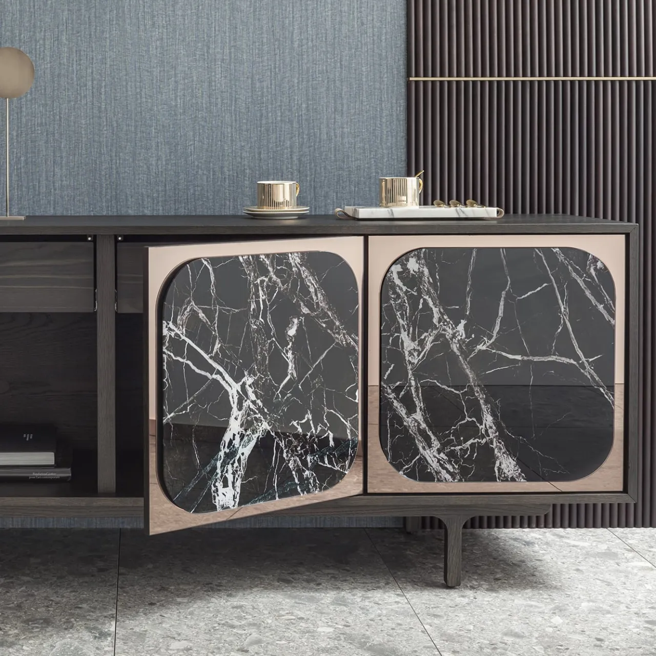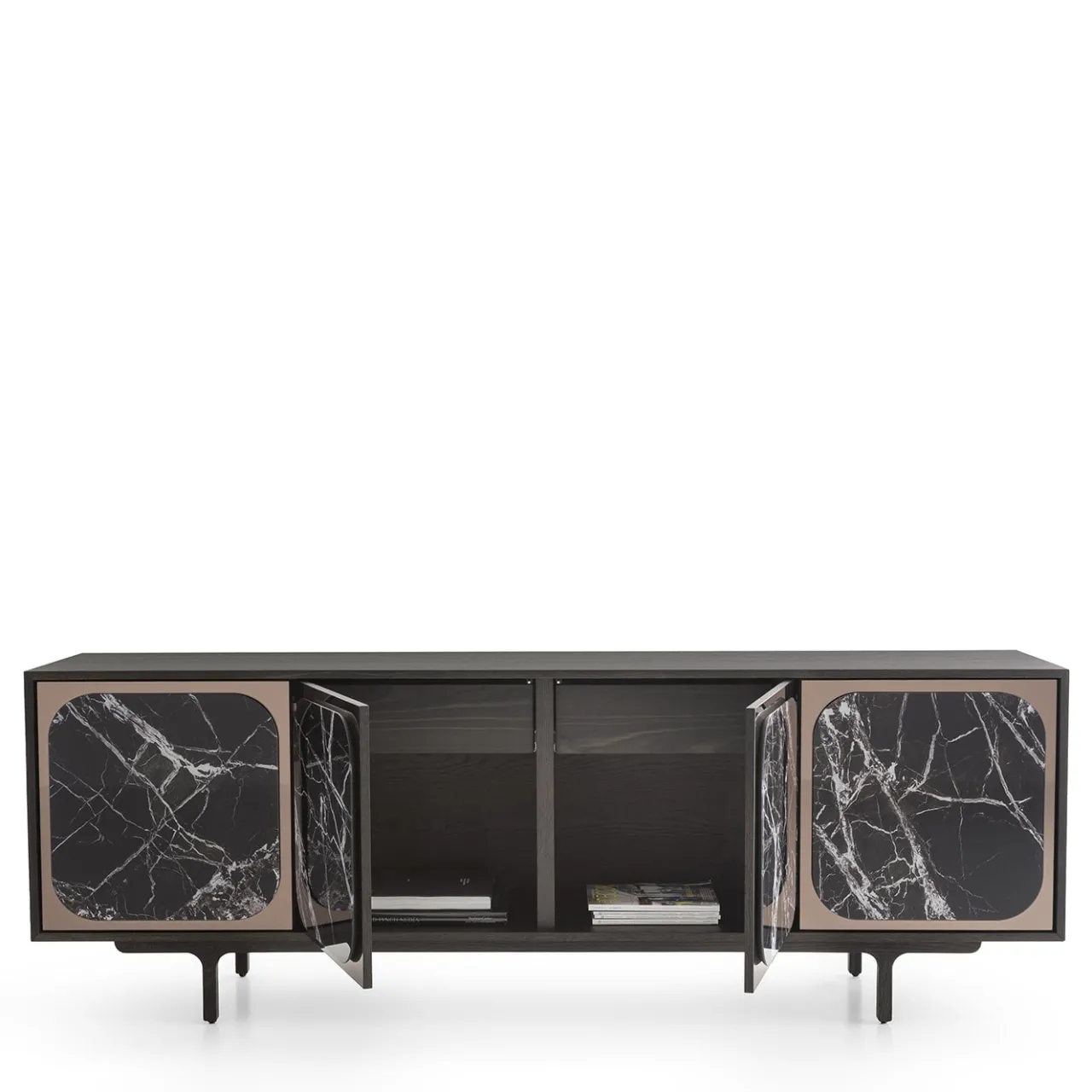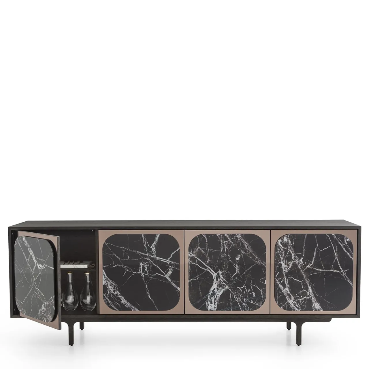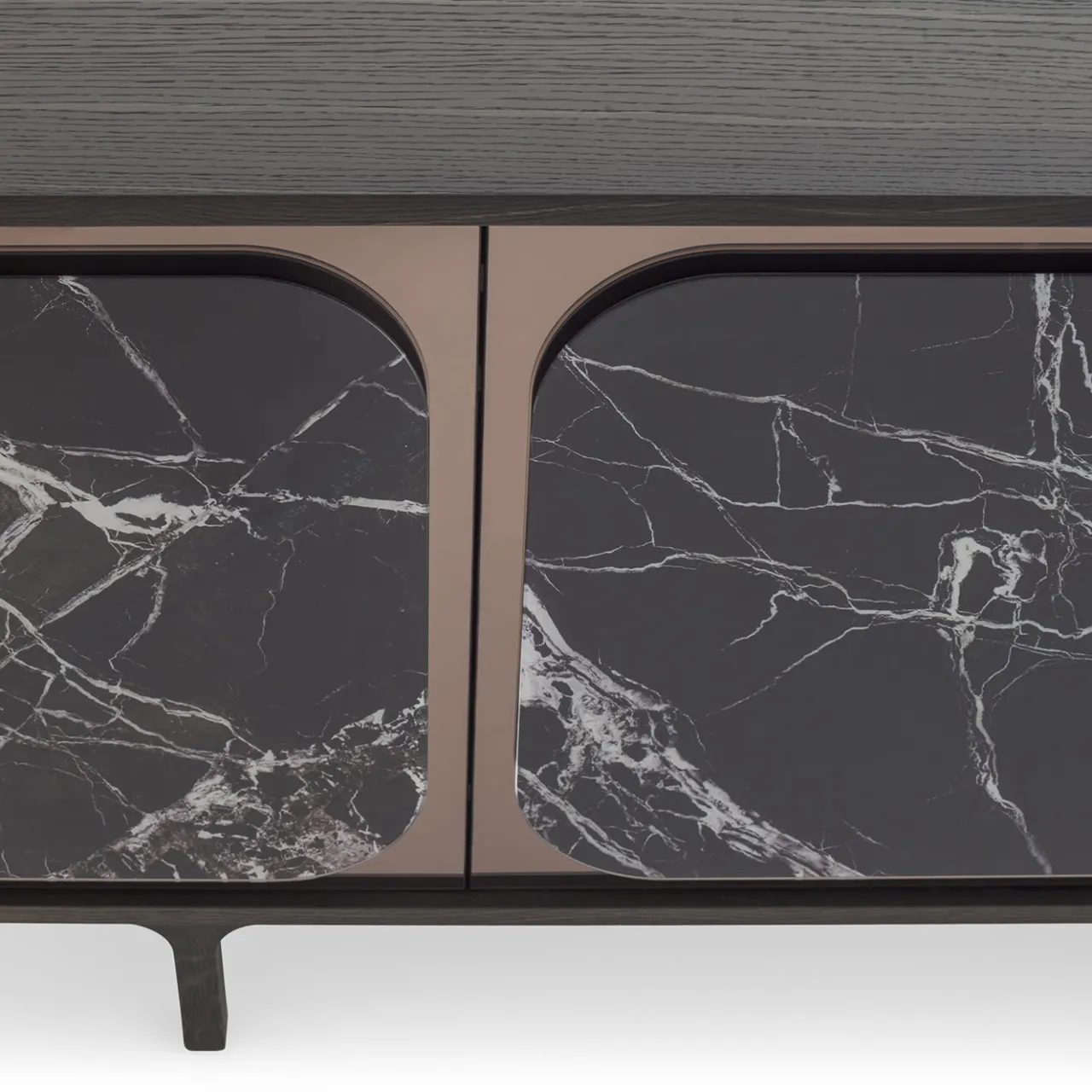 Audace e raffinata al tempo stesso, questa credenza seduce con gli inserti in vetro marmorizzato Breccia Imperiale che decorano le ante frontali in metacrilato bronzato a specchio. Un basamento in rovere massiccio tinto scuro sostiene la struttura in MDF, impiallacciata in rovere Laguna e rifinita con vernici a basso impatto ambientale. I ripiani regolabili in vetro fumé e i cassetti in legno all’interno sigillano il design.