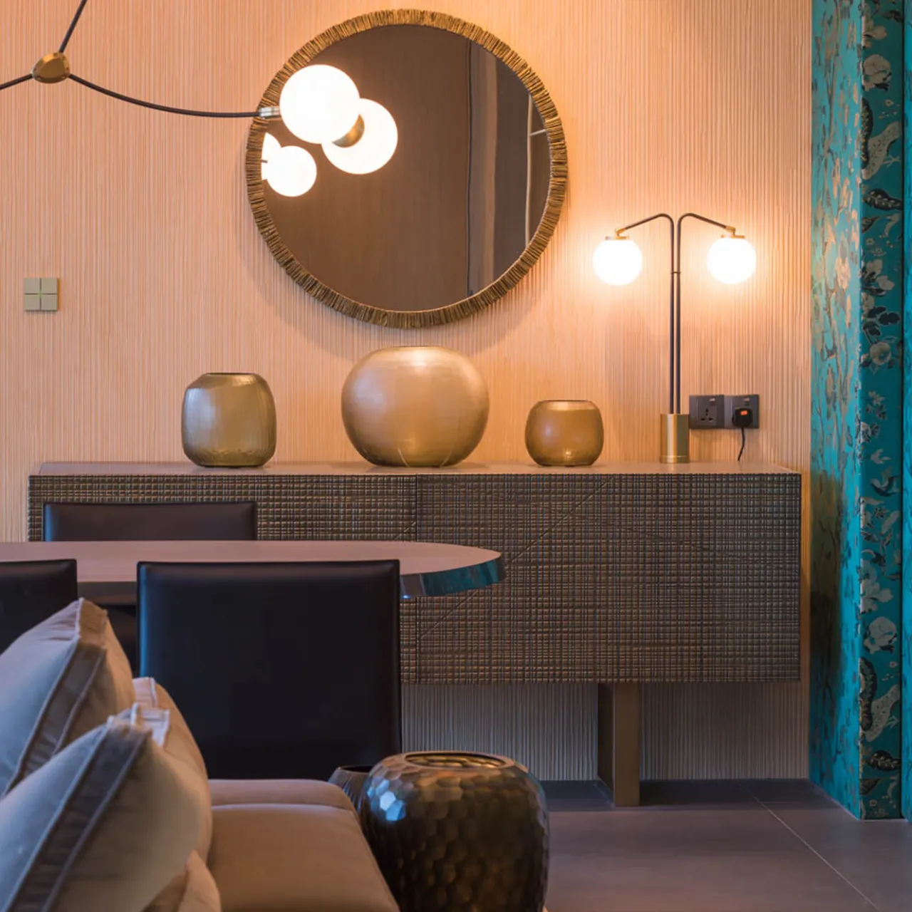 Questa superba credenza fa parte della Collezione Maxima, che si distingue per la sua rigorosa silhouette geometrica e per gli splendidi pannelli frontali e laterali. Il piano in marmo Gris Vignè è completato dalla restante struttura in noce Canaletto, dotata internamente di due cassetti completamente estraibili. I pannelli vantano l’innovativa finitura Liquid Metal, ottenuta miscelando polvere di metallo e applicandola sulla superficie in legno, per un contrasto materico dinamico. Questo pezzo sarà un prezioso oggetto di arredamento funzionale, grazie alla sua pregiata lavorazione artigianale e all’armoniosa combinazione di innovazione e tradizione.