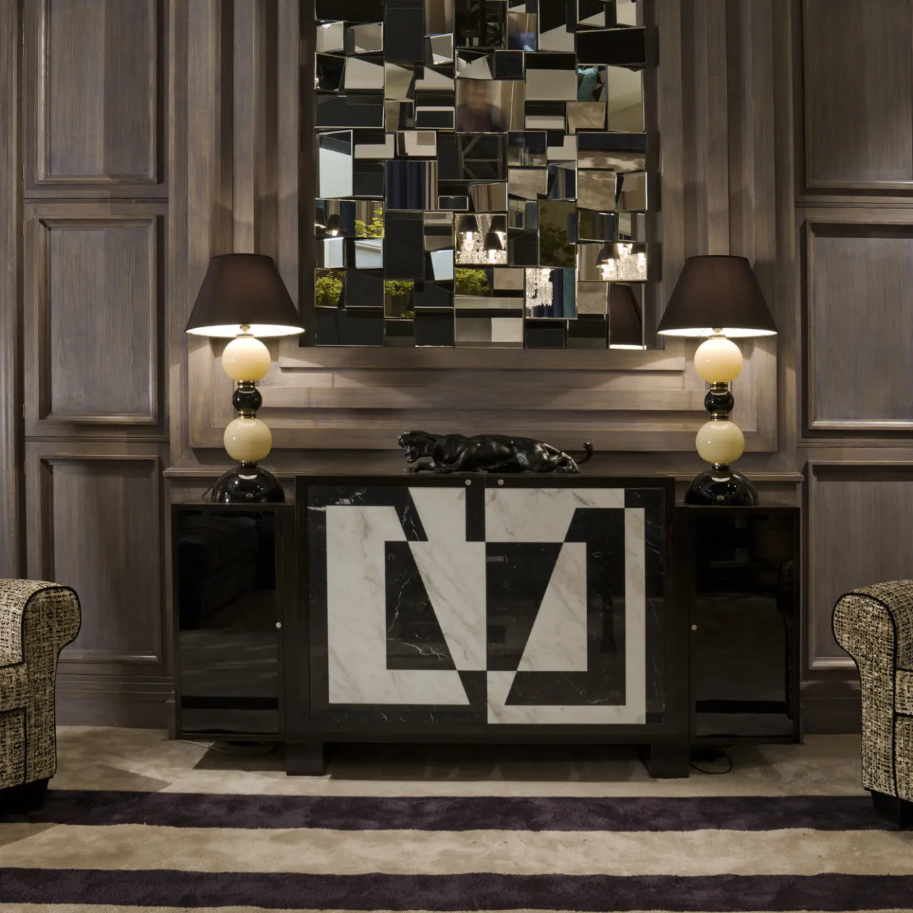 Un pezzo straordinario di arredamento funzionale, questa credenza si ispira al design audace dei mobili art déco e presenta una struttura artigianale in rovere con gambe corte. Interamente dipinto a mano con finitura nera, il mobile presenta due ante: i due pannelli laterali sono rivestiti in vetro e affiancano le due grandi ante centrali, il cui frontale è impreziosito da intarsi in marmo nero Marquina e oro Calacatta, che creano una magnifica decorazione geometrica con una combinazione di colori bianco e nero. All’interno, il mobile è rifinito in un suggestivo rosso con ante a specchio.