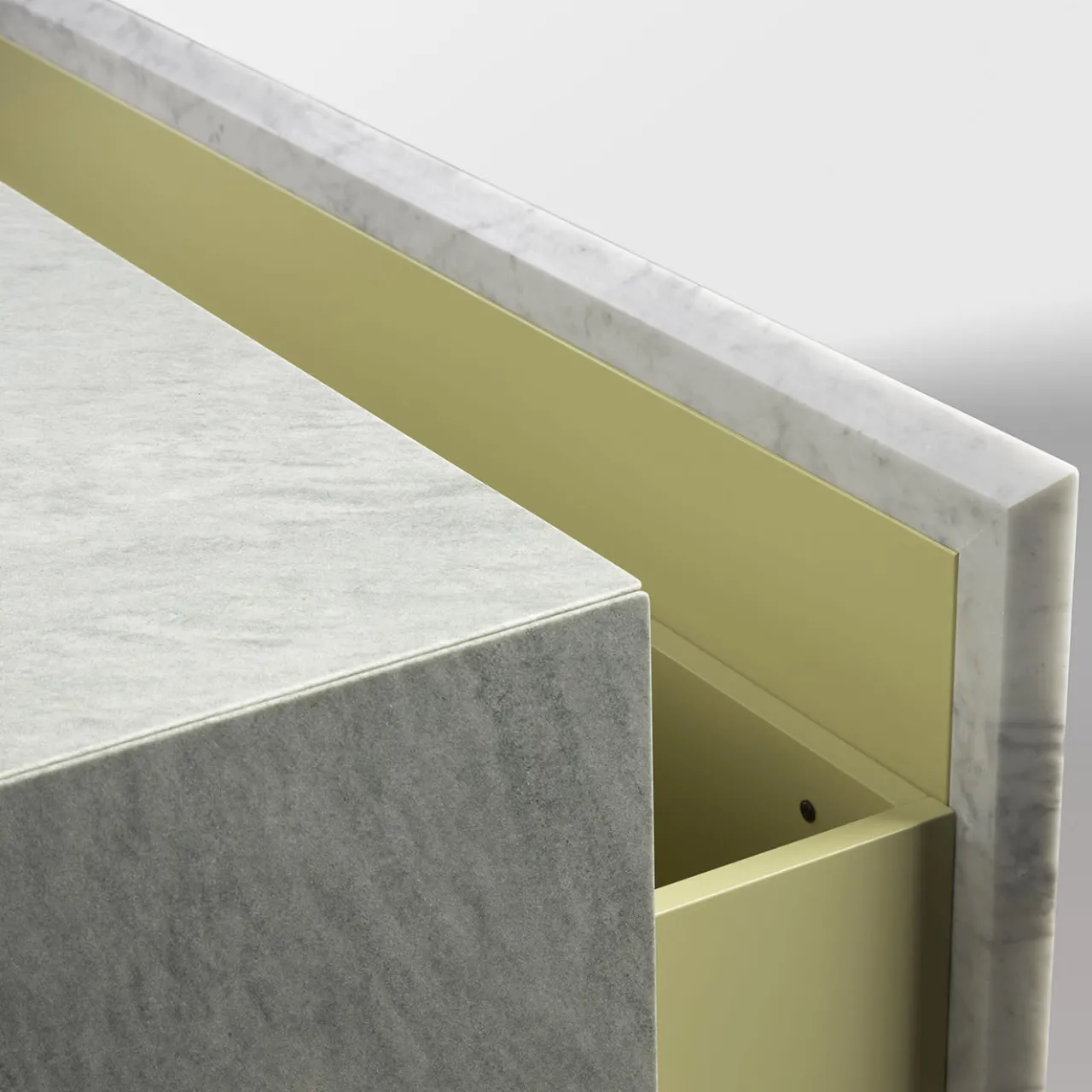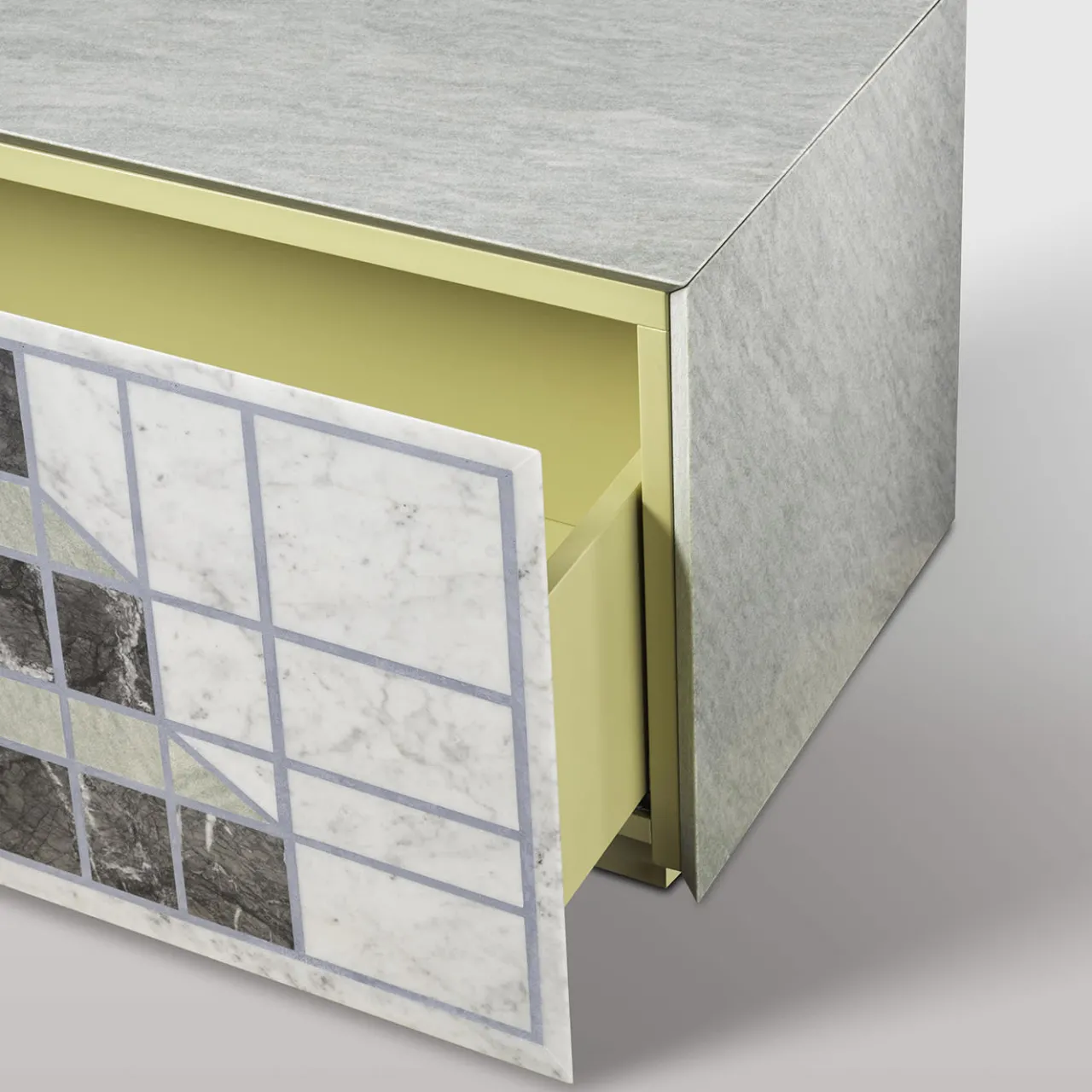 Credenza con struttura interna in legno laccato opaco rivestita in marmo verde Cipollino, frontale in marmo alleggerito di 5 mm con grafica Myth disegnata da Mae Engelgeer. Il frontale alleggerito è composto dai seguenti marmi: Bianco Carrara, Grigio Carnico, Verde Cipollino e cemento color Avio.