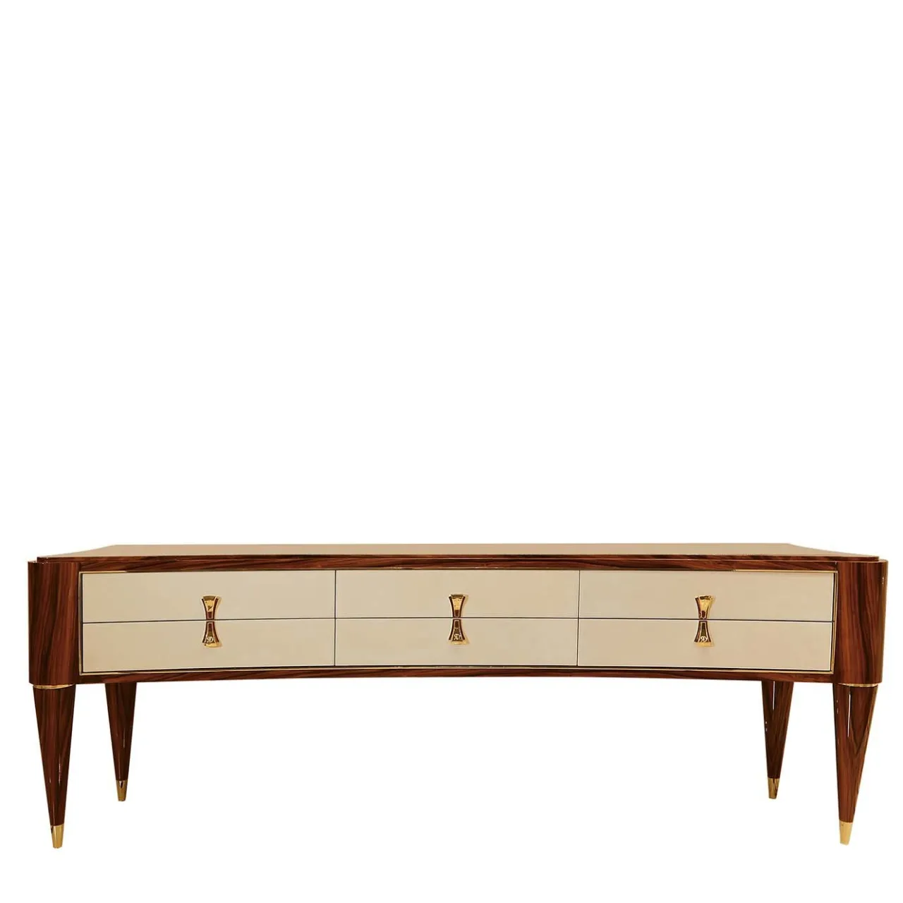 La credenza Montenapoleone è realizzata in legno massiccio con finitura lucida Palissandro Santos. Accentuata da dettagli in metallo dorato per un tocco raffinato, la sua struttura elegantemente curvata è dotata di sei cassetti rivestiti in nabuk. Dotata di meccanismi di chiusura ammortizzata, questa consolle è un’aggiunta elegante e funzionale alla casa.