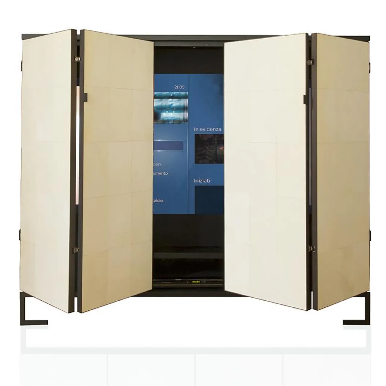 Questo mobile presenta una struttura in rovere scuro e ante rivestite in pelle. La caratteristica principale è l’apertura completa delle quattro ante, che si ripiegano sui lati del mobile, lasciando aperto l’intero spazio frontale. Su richiesta, i rivestimenti delle ante sono personalizzabili.