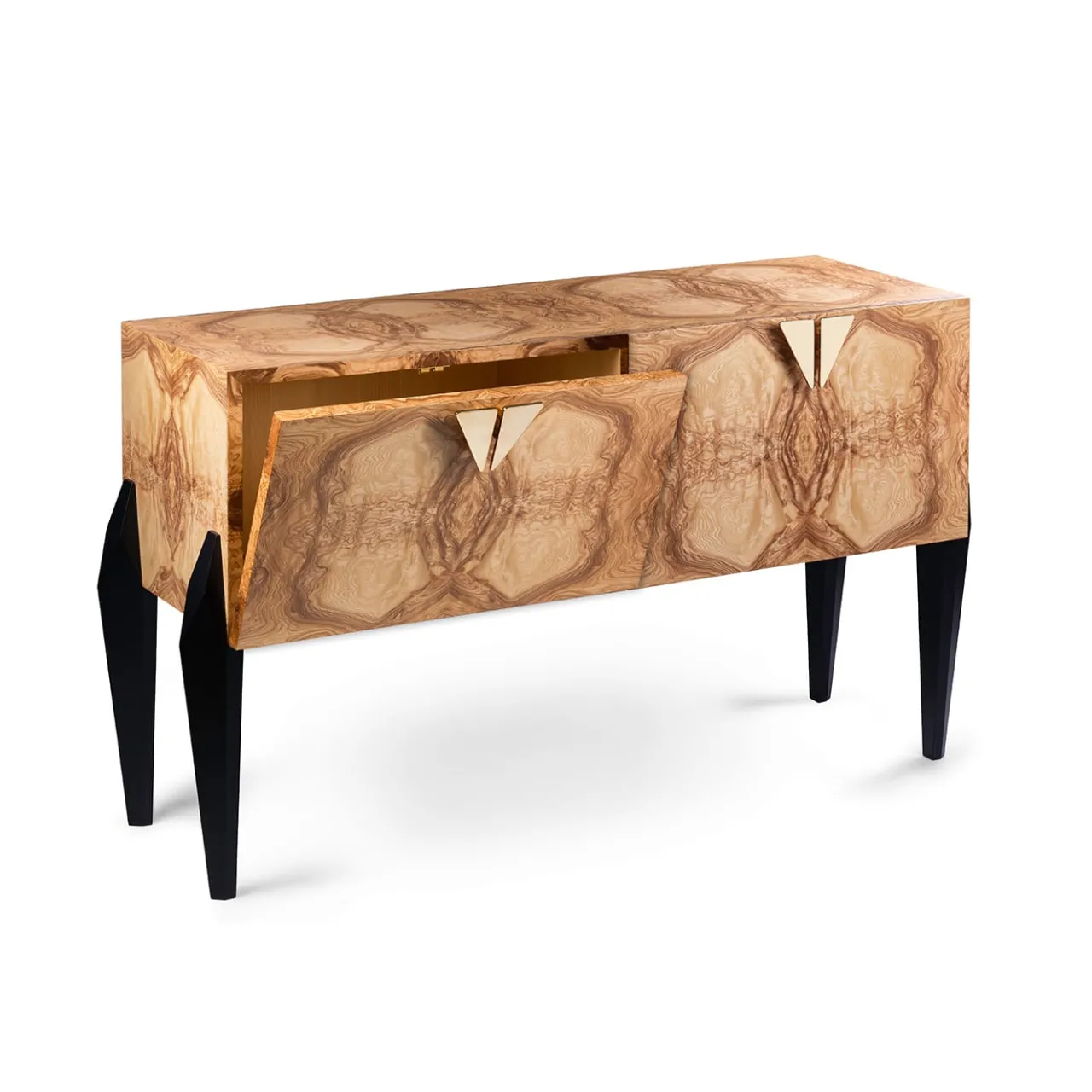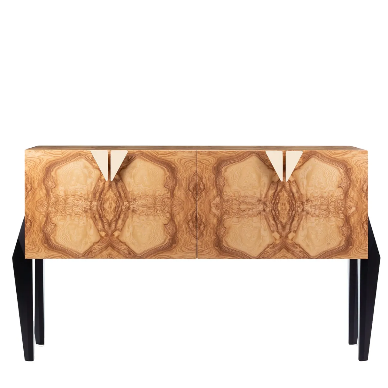 Chiamata con il nome di “ragno” per la particolare forma delle sue zampe, questa straordinaria credenza emana un’allure moderna, sofisticata e senza tempo. Ispirata ai sontuosi ambienti hollywoodiani degli anni ’30 e ’40, è realizzata a mano con materiali pregiati: radica, ulivo ed ebano si fondono in questo splendido design, arricchito da maniglie placcate in oro 24k per una maggiore raffinatezza.