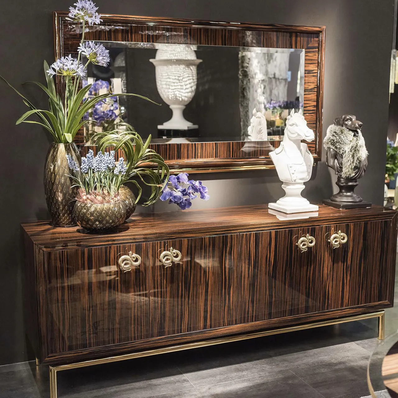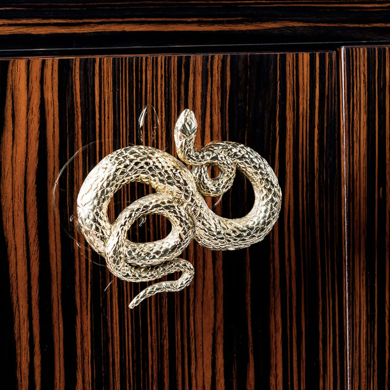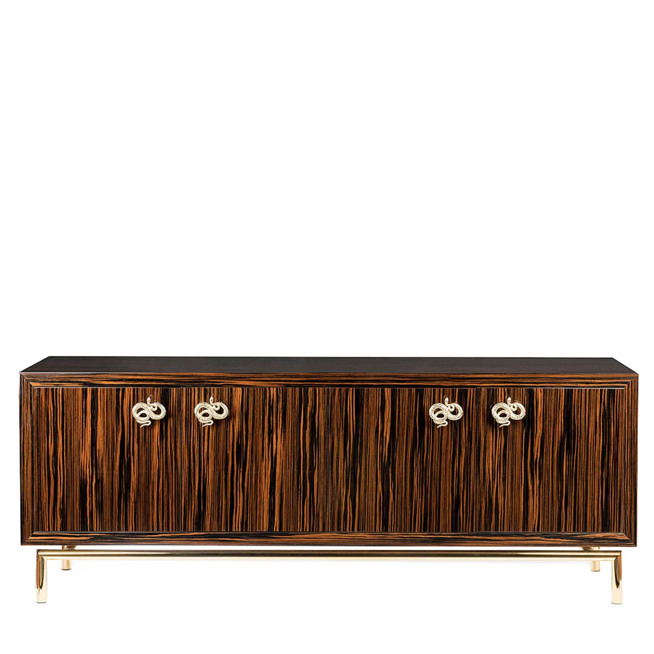 Questa raffinata credenza a quattro ante fa parte della collezione Original Sin creata dal designer Giorgio Ragazzini per VG. La sua struttura è realizzata in autentico legno di ebano con finitura lucida e giunzioni a 45 gradi. I bordi e lo schienale sono spazzolati lucidi, mentre il resto della finitura è lucido per evidenziare il suggestivo disegno delle venature naturali. L’interno presenta una finitura opaca e uno specchio posteriore con un ripiano strutturale e due ripiani aggiuntivi in dotazione. I pomelli e la maniglia hanno un’esclusiva finitura oro 24k.
