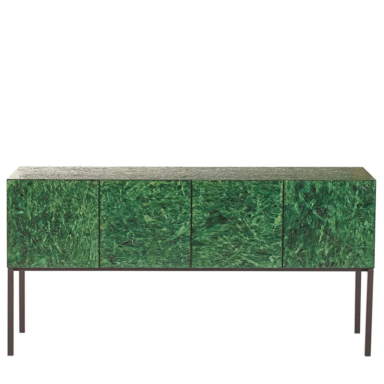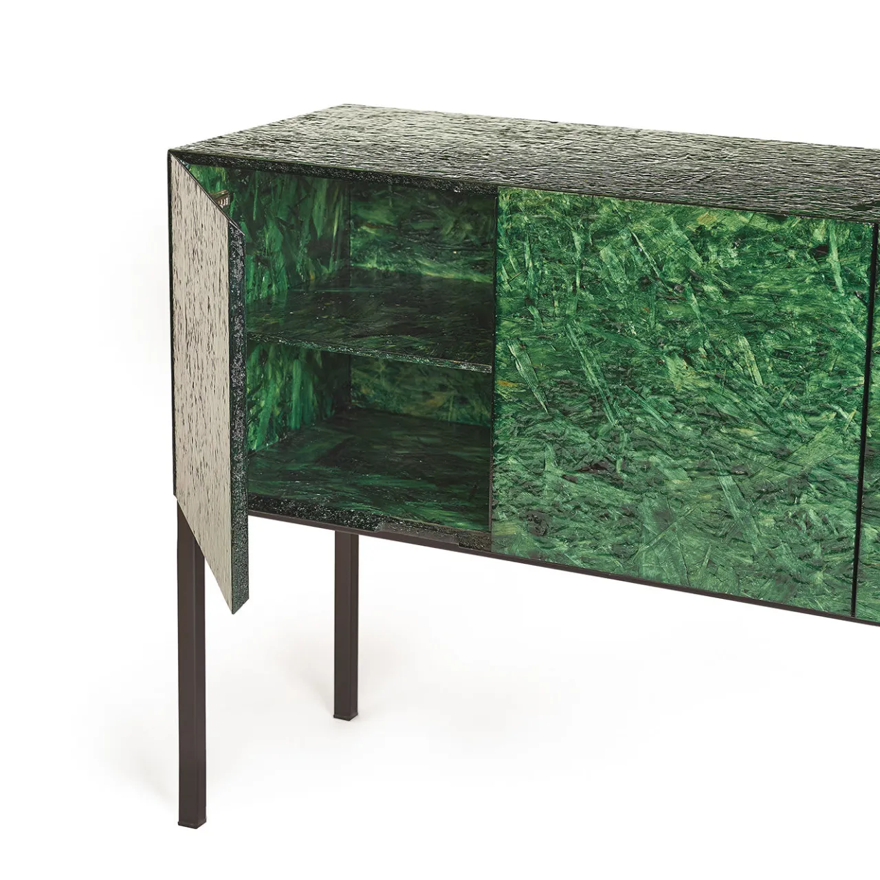 Questa credenza a 4 ante battenti dal design unico, di colore verde, aggiungerà un tocco di eleganza contemporanea alla vostra casa. La scocca è realizzata interamente in OSB lucido, mentre i ripiani interni e la base sono in metallo laccato nero, con sezione 25×25 mm. Le ante sono dotate di apertura con maniglia a scomparsa. Dimensioni: 160x40x80H cm.
