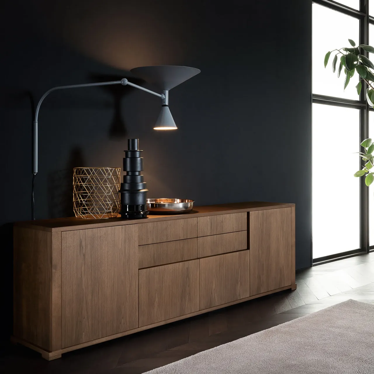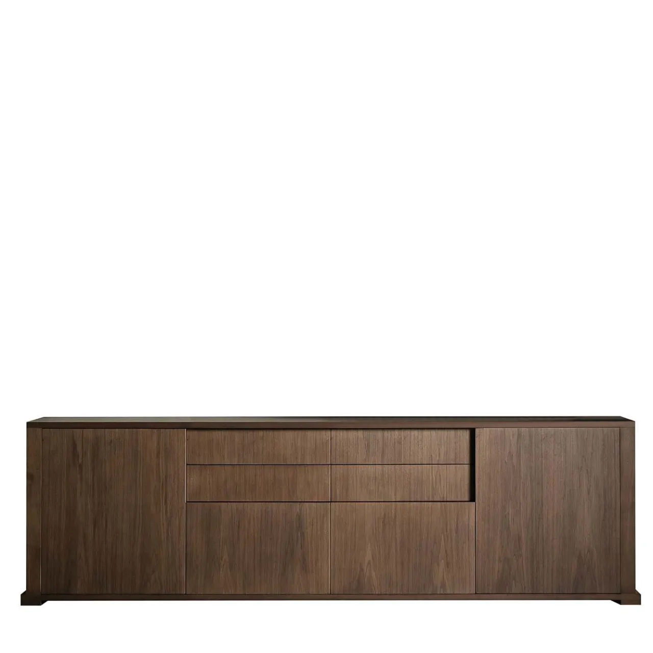 Questa credenza esprime l’eleganza della semplicità. Squisitamente realizzata in legno di noce con finitura naturale, è composta da due ante laterali e sei cassetti centrali (quattro piccoli e due grandi). Un superbo oggetto d’arredo funzionale, che eleva l’aspetto di un corridoio, di un ingresso o di un soggiorno.