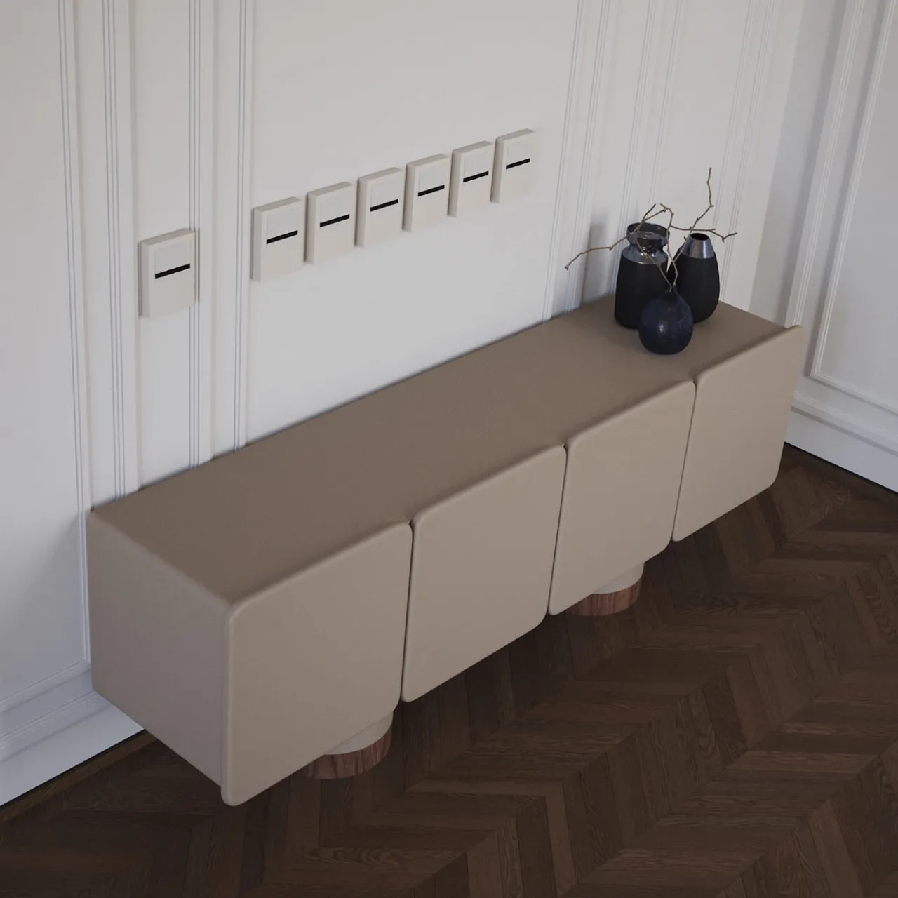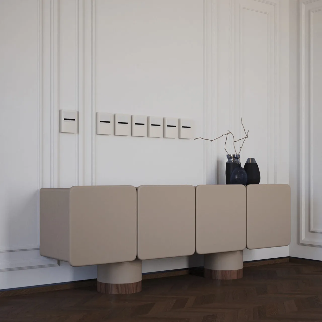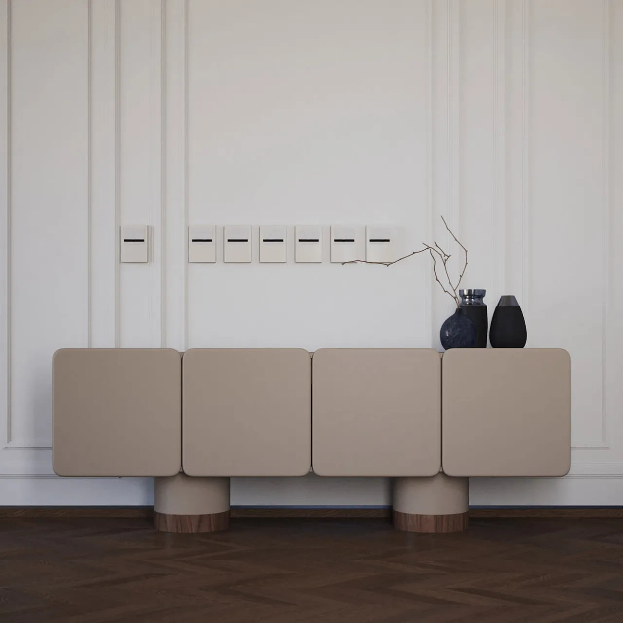 Questa elegante credenza è caratterizzata da quattro ante arrotondate con cerniere a chiusura ammortizzata e due eleganti gambe rotonde presentate in finitura laccata opaca e Noce Canaletto. Il suo design comprende frontali e angoli splendidamente arrotondati, che aggiungono un tocco di raffinatezza arricchito anche dal cassetto interno e dai ripiani in Noce Canaletto. La finitura laccata grigio opaco conferisce un aspetto liscio e moderno.