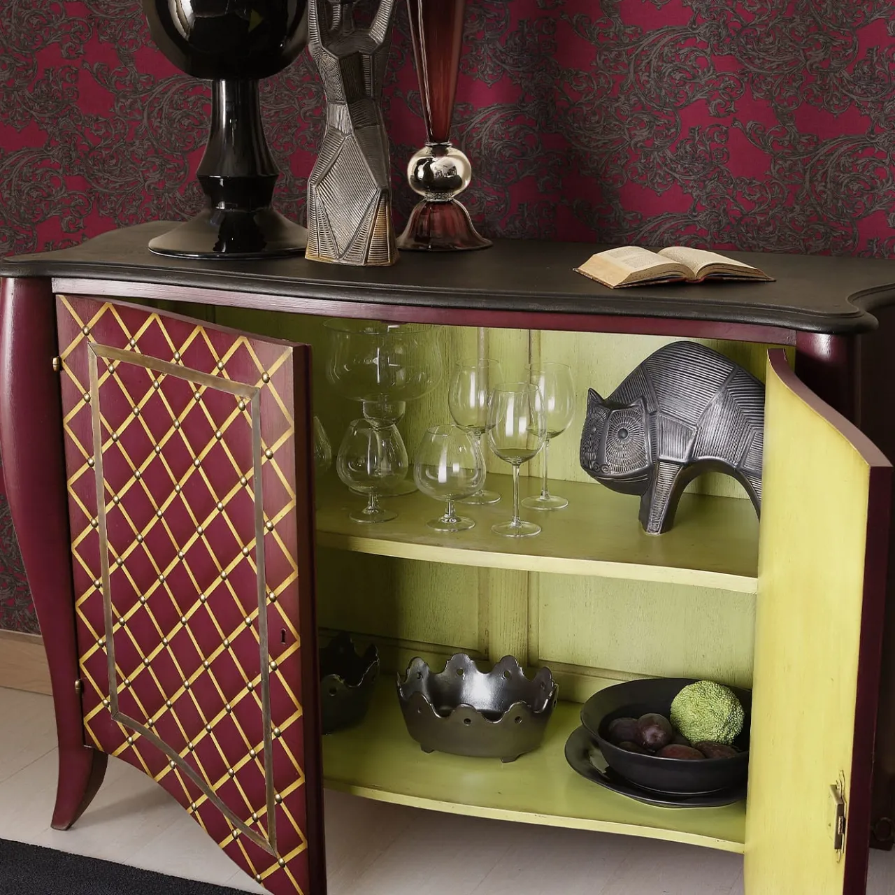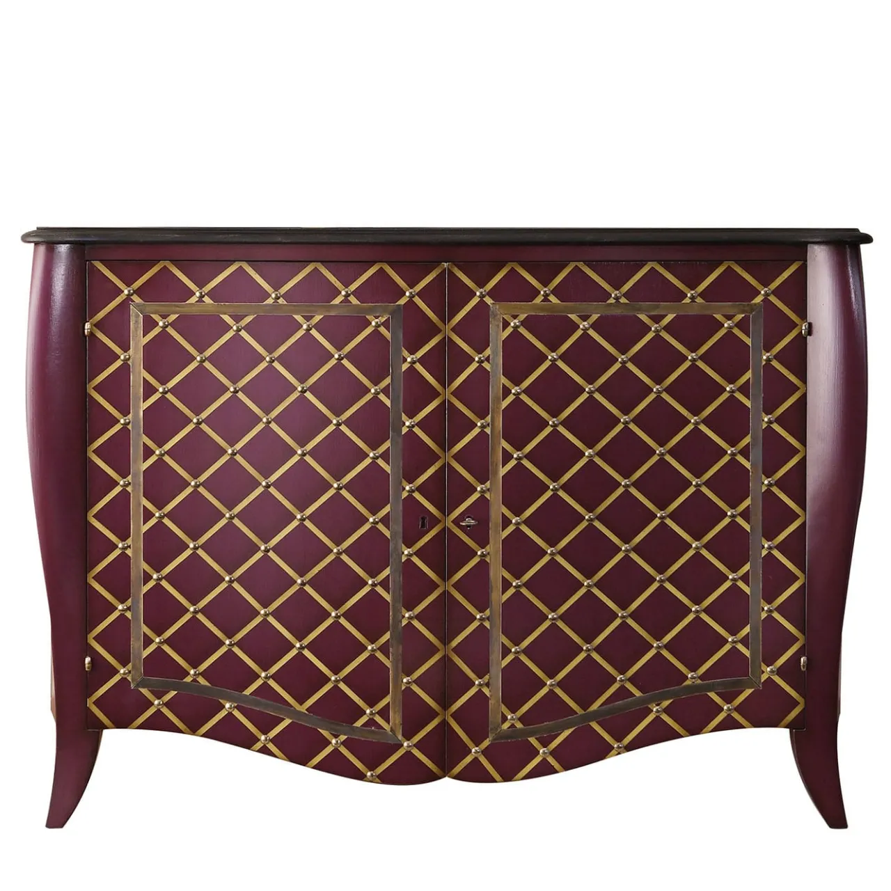 Caratterizzata da un motivo a rombi gialli accentati da borchie, questa credenza vanta una struttura in legno tracciata da linee sinuose e armoniose e rifinita in un tono glamour di viola. Le cornici in ottone accentuano le due ante, che si aprono per rivelare un ampio mobile contenitore laccato in un vivace colore verde mela per aggiungere un tocco di freschezza al pezzo. Un tranquillo piano con finitura nera chiude il design.