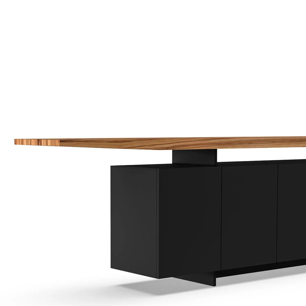 Questa credenza minimalista ed elegante in legno laccato con ante a battente è caratterizzata da un piano in legno di olivo chiaro che sembra prendere il volo sulla solidità della struttura scura e nera dell’articolo. Il prodotto può essere personalizzato su richiesta. Fa parte della collezione Carpenteria dell’azienda. Larghezza piano: 367 cm. Larghezza struttura: 267 cm.