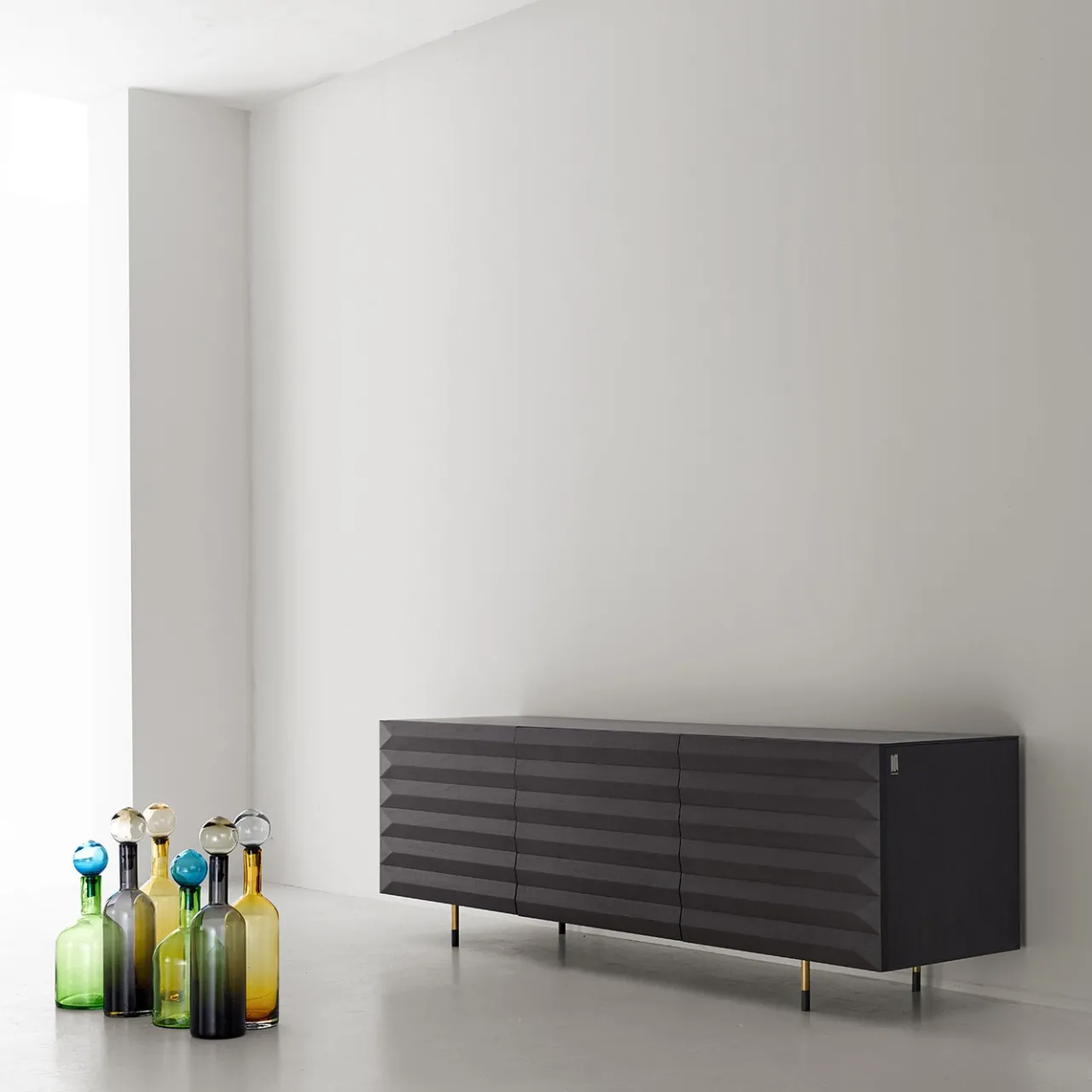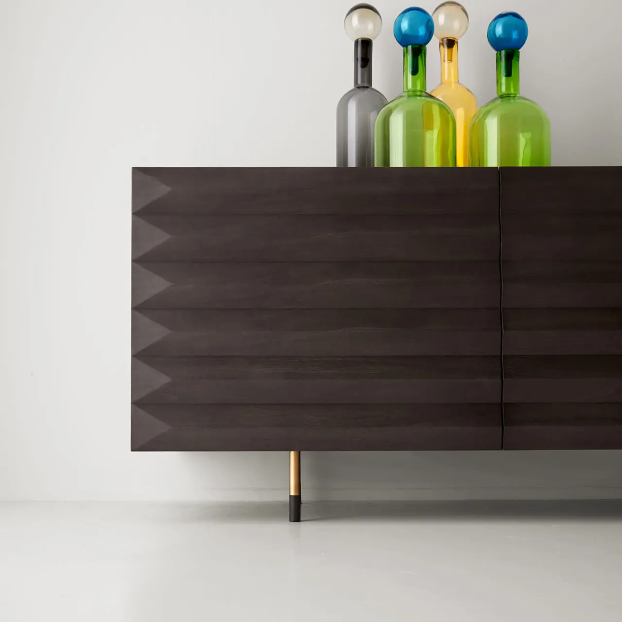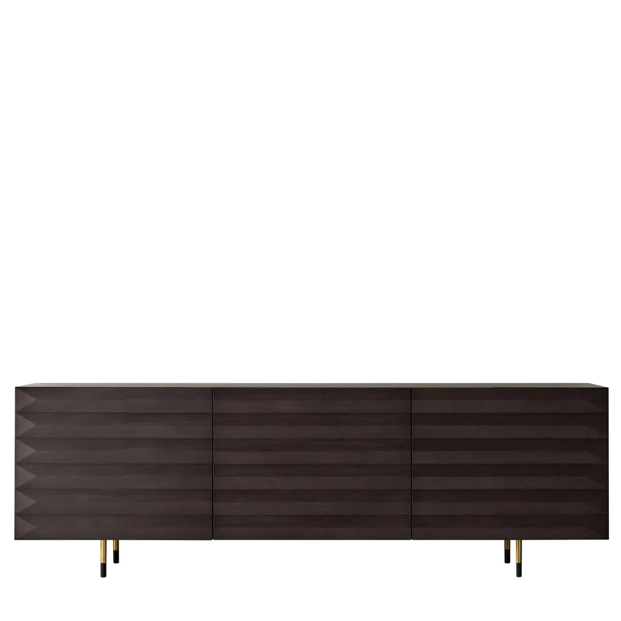Credenza a tre ante in pregiato legno di Noce Canaletto; l’intero mobile è in legno impiallacciato in essenza di Noce Canaletto e parti in legno massello. I piedi sono cilindrici in metallo color bronzo e terminano con una punta in legno. Sono presenti tre ripiani interni in vetro ed è possibile inserire luci a led su richiesta. L’apertura avviene dall’alto attraverso la svasatura sull’anta. Tutto è costruito internamente nella nostra falegnameria in Italia. Disponibili vari colori.
