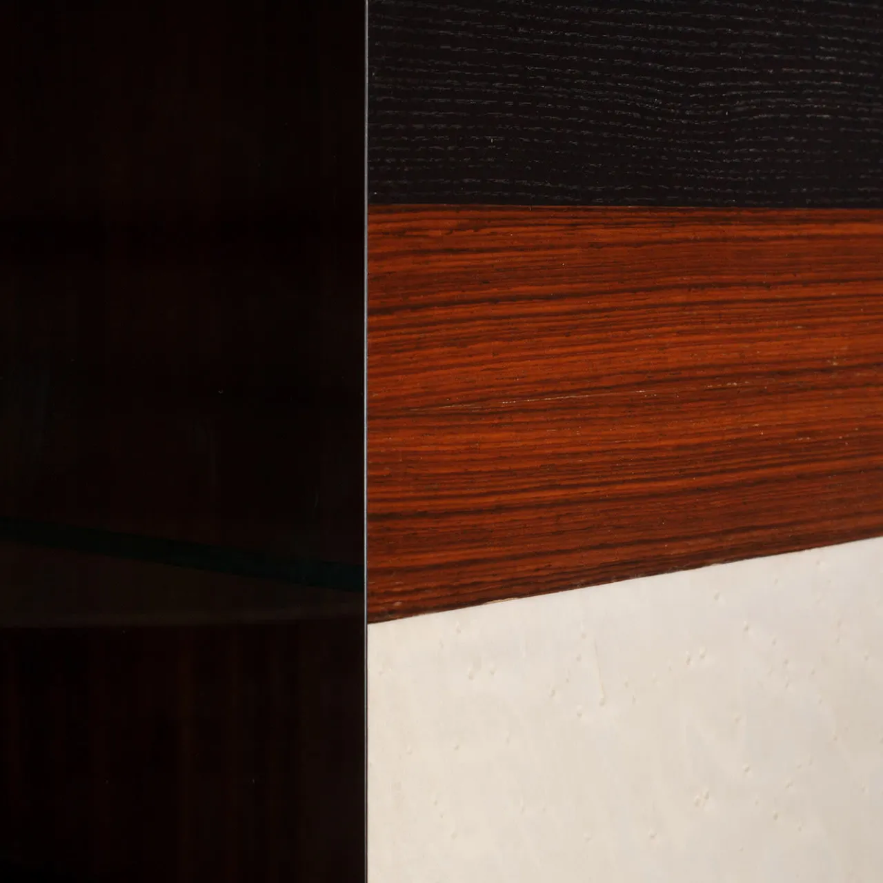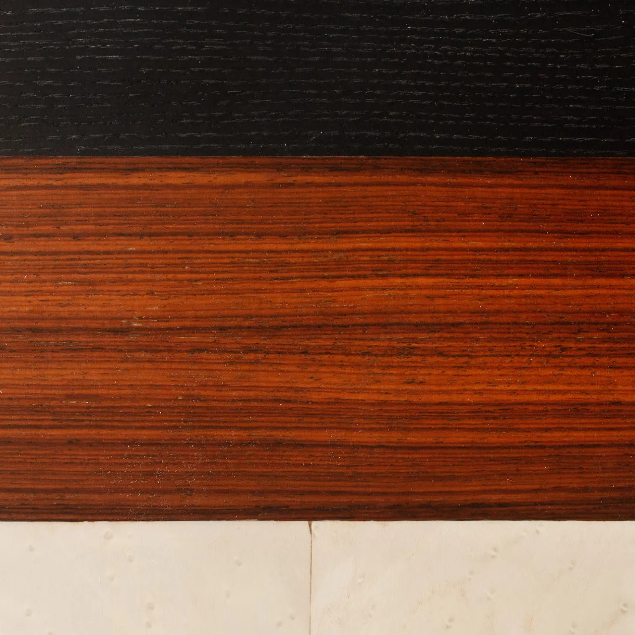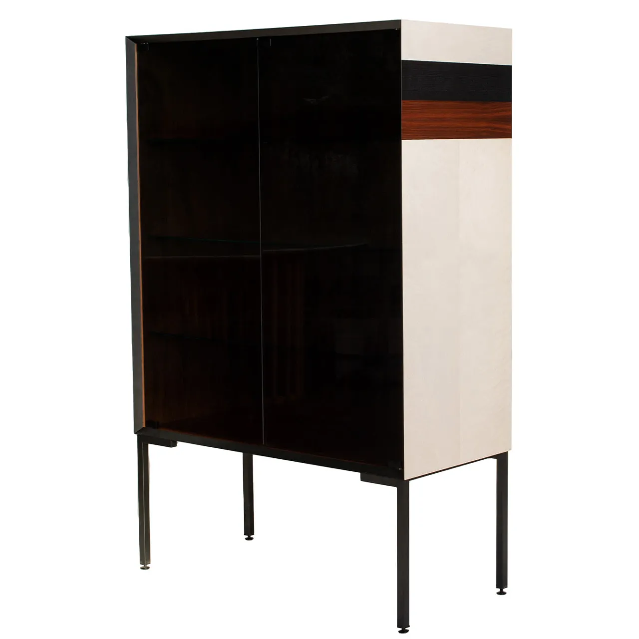 Questa sofisticata cassapanca a due ante presenta una struttura interna in palissandro Santos sostenuta da quattro piedi a L in metallo laccato. L’esterno è squisitamente realizzato da maestri intagliatori con legno di frassino sbiancato. Le ante e i ripiani centrali sono in vetro fumé, mentre i pannelli in legno sono caratterizzati da dettagli in legno bois viola ed ebano che creano una decorazione geometrica di grande effetto per un pezzo che è un’opera d’arte funzionale.