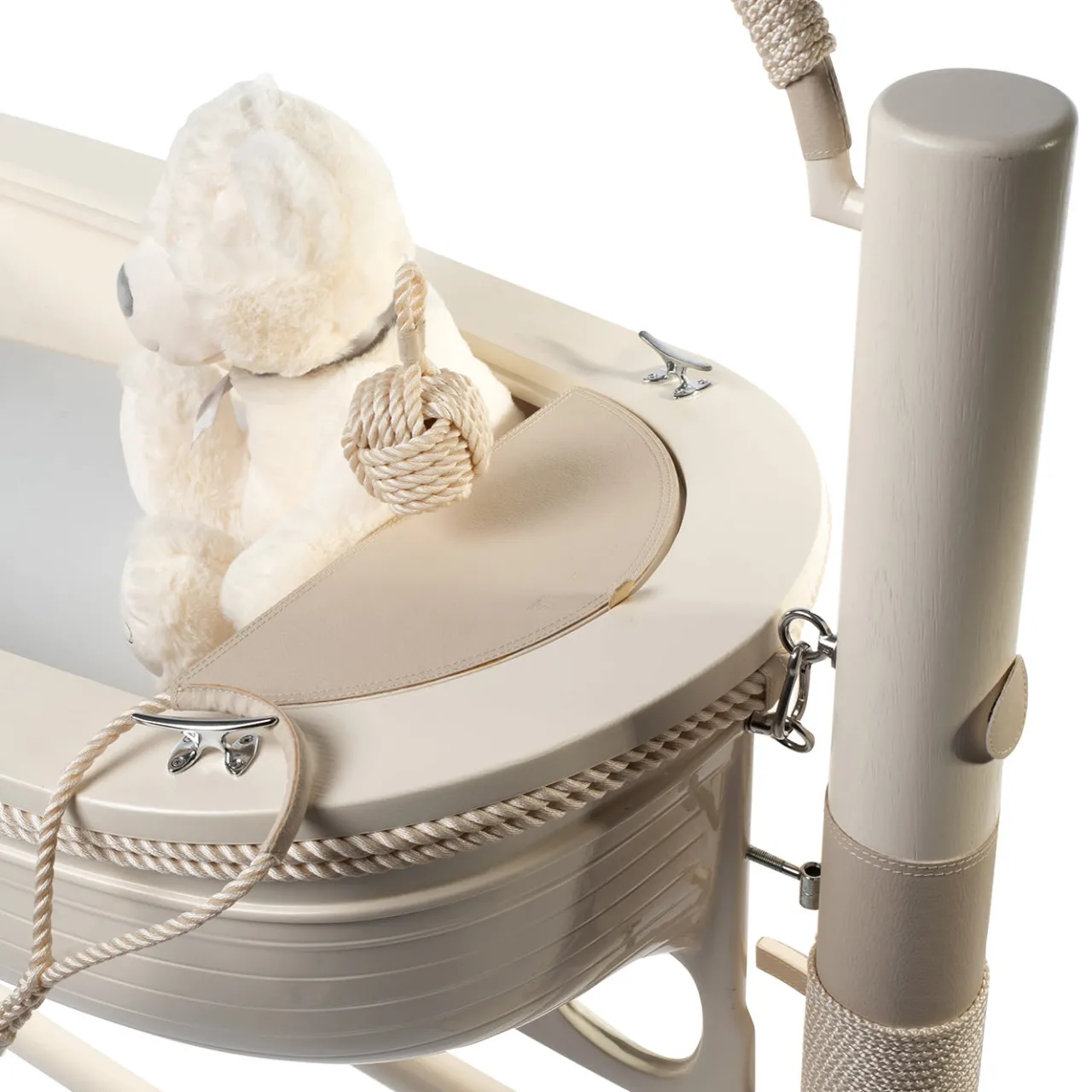 Questa culla a forma di barca è un nido accogliente per i neonati e permette ai genitori di cullare dolcemente i loro bambini per farli addormentare, come se fossero sulla superficie dell’acqua. Arricchita da coerenti accenti di corda nautica, la culla vanta una robusta struttura in legno laccato bianco con inserti in ecopelle, fibra di vetro e acciaio. Un piano, incluso nella fornitura, può essere sostituito per trasformare il design in uno scrittoio.