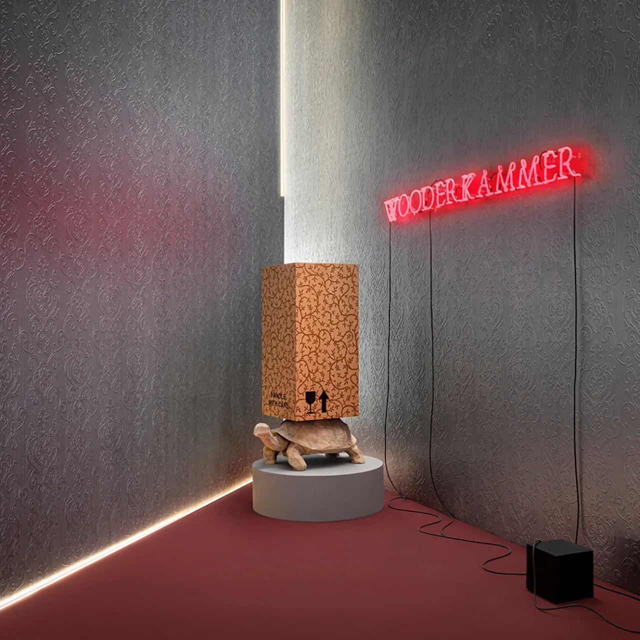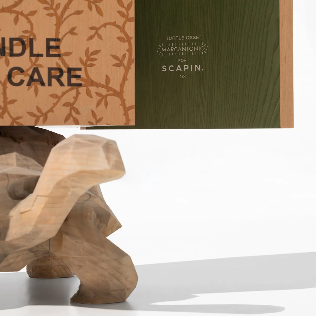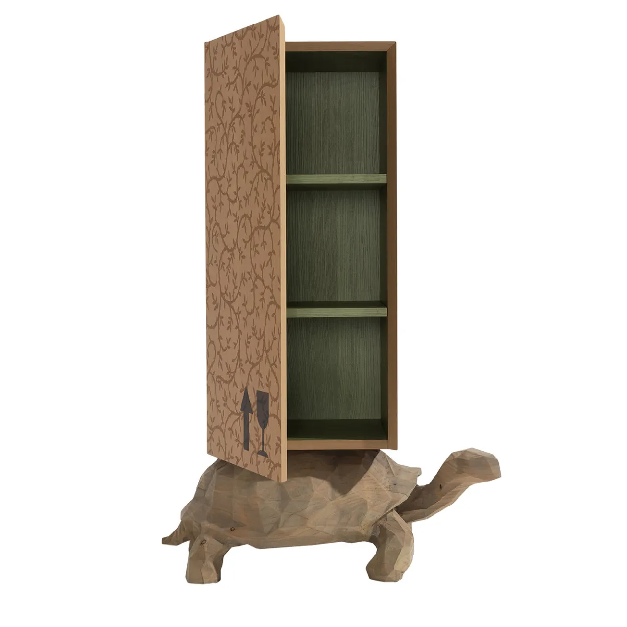 Parte della collezione Wooderkammer, prodotta in edizione limitata di soli otto esemplari, questa scultura-armadio non convenzionale è un pezzo di grande effetto composto da due elementi contrastanti. La tartaruga è interamente scolpita a mano da un’unica sezione di tronco d’albero e sostiene un’alta cassa in legno impreziosita da un raffinato intarsio di rami sinuosi eseguito interamente a mano. L’interno è rifinito in verde oliva e l’esterno presenta il segno dell’icona della fragilità su un lato, il logo dell’artista e il numero dell’articolo sull’altro e la scritta “Handle with Care” sul davanti.
