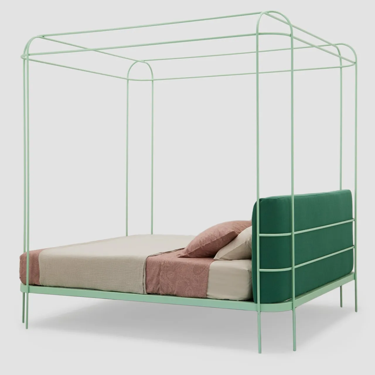 Immaginare di dormire sotto un cielo stellato è la suggestione che evoca questo elegante letto matrimoniale dal design a pergola. Avvolgente e ariosa, la struttura in ferro battuto verniciato in verde menta offre l’illusione di una vista potenzialmente illimitata che, unita alla testiera imbottita, promette di accentuare il riposo con un senso di pace in più. Le frizioni tornite consentono un facile montaggio e smontaggio.