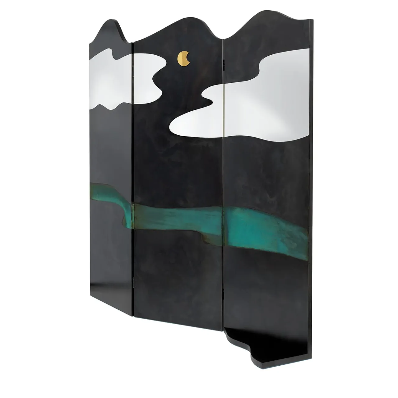 Un grande schermo concepito come un sipario teatrale rappresenta su entrambi i lati paesaggi naturali immaginari: un cielo notturno e il profilo di una serie di colline. Le variazioni cromatiche ottenute grazie alle diverse ossidazioni superficiali ricordano i colori di un dipinto su tela, con l’immagine risultante che diventa una quinta teatrale. Il rame spazzolato e l’ottone DeLabré modellano i contorni di uno spazio lontano, mentre il nero materico della lamiera si giustappone al verdastro arioso nella costruzione immaginifica di un paesaggio mutevole.