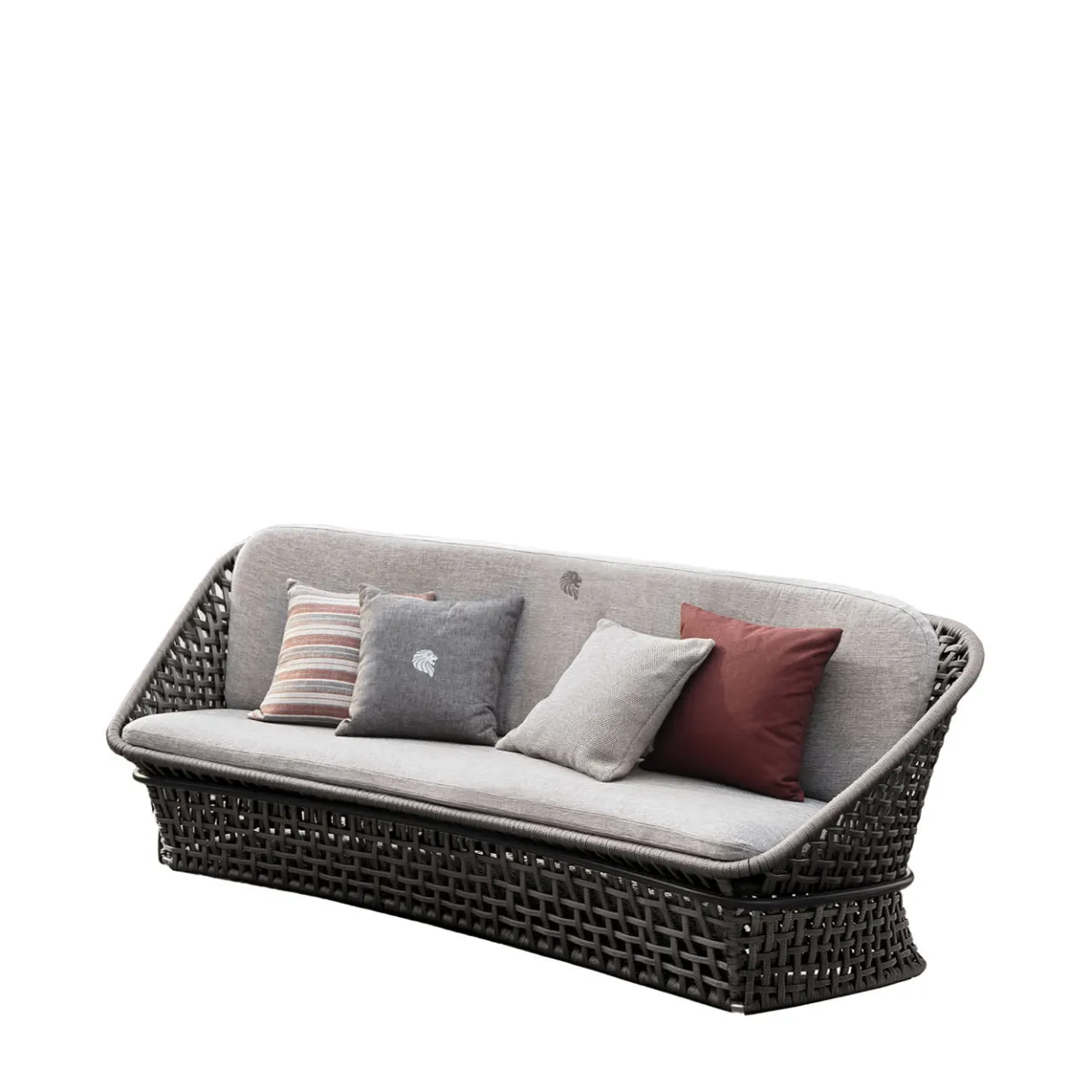 Divano a 2 posti disponibile in tessuto appositamente trattato. Imbottitura dei cuscini in dacron impermeabile. Struttura in combinazione di metallo nero satinato trattato in cataforesi con logo Giorgio Collection inserito e cordame nero. Speciale copertura per esterni inclusa nel prezzo.
